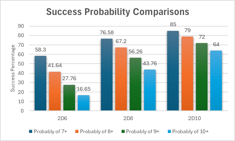 The above two graphs show the probability curve comparison between 2D6, 2D8, and 2D10. It then shows the odds of roll a 7+, 8+, 9+, and 10+ on those dice. I considered expanding that to 5+ and 6+ but it got cluttered, so hopefully the above makes the point clear enough.