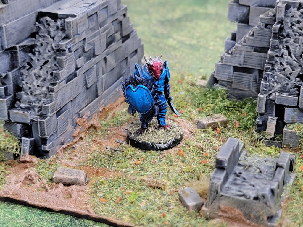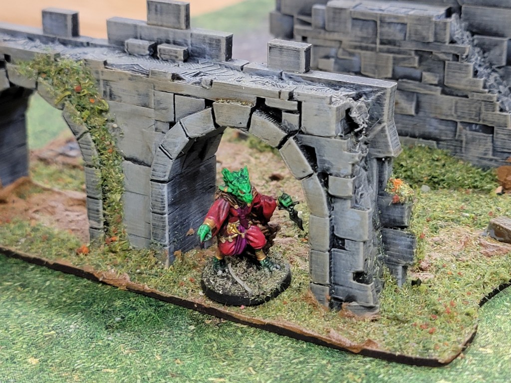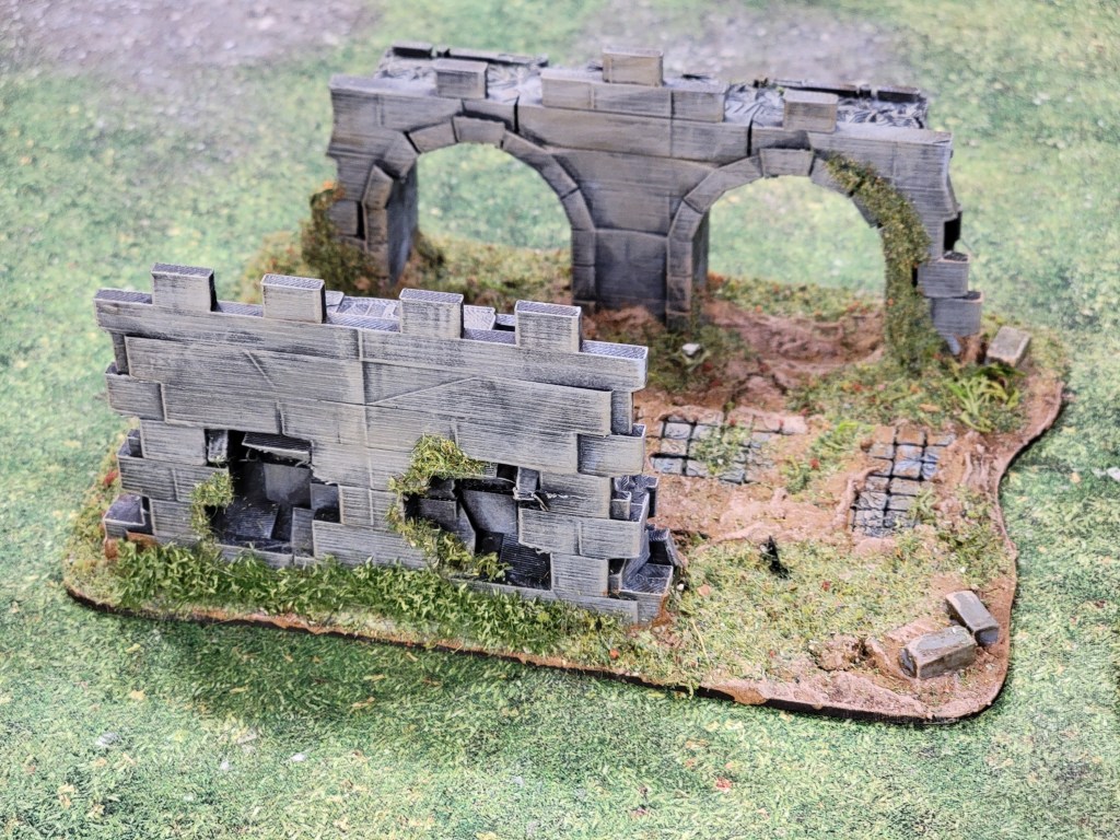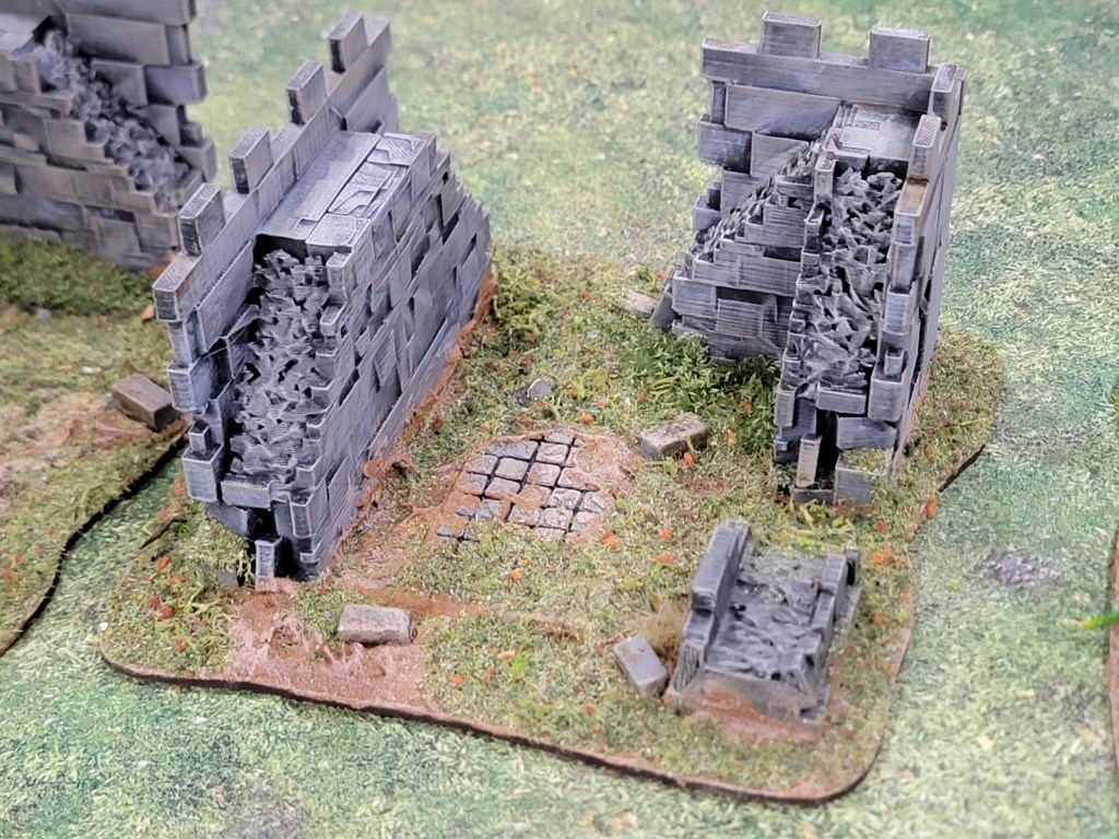 The walls and bit of cobblestone peaking out are all 3D printed. Simple triad dry brush followed by a super thinned warm Sepia tone wash. The bricks sitting on the ground are some basing bricks I had laying around. They’re huge and I’ve struggled to use them in basing so this was a welcome opportunity to lay them down.
