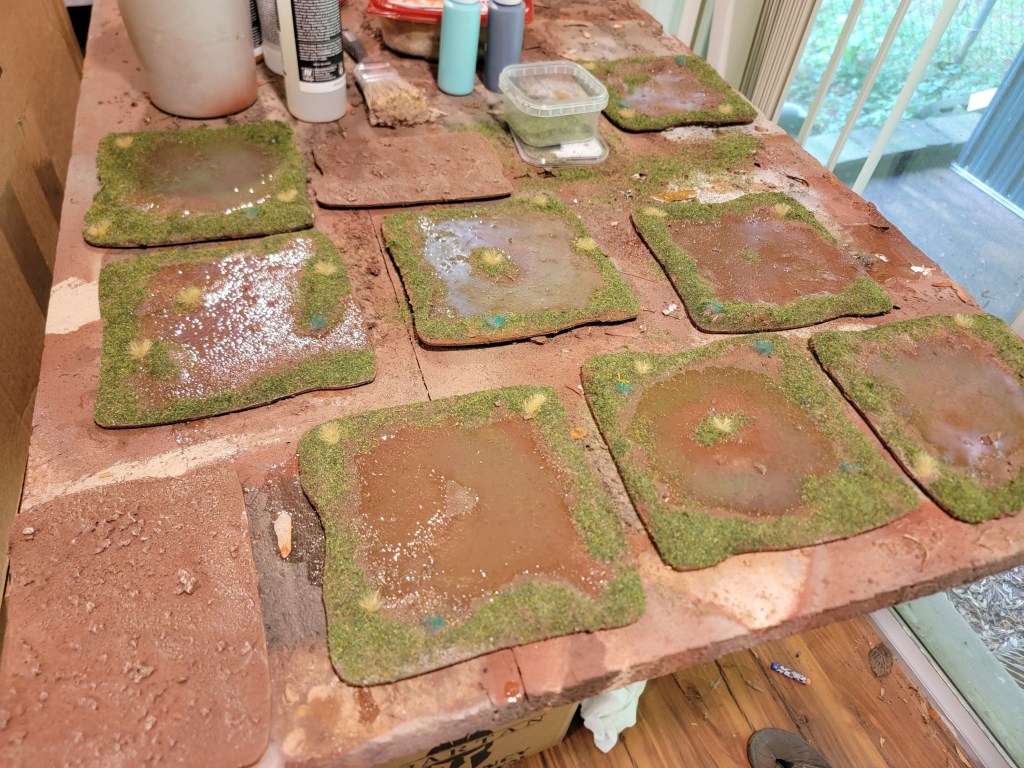 The bases are MDF from Warbases. I had intended to use them to do up some fancy 15mm terrain but honestly the burden of doing so has put those buildings off by more than a year. So here we are using them for area terrain in 28mm. I used a normal basing paste I had laying around to get the very orange earthen texture, then washed and dry brushed it.