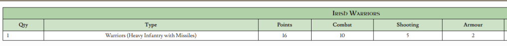 Here we have the most extreme difference: I’ve given the Vikings the highest armor in the game and the Irish the lowest. I also gave the Irish some shooting capability. Now, of course, the Irish unit is worth half as much. The base value of either unit is 21 points but once I modified their armor they went up and down by five points–roughly 25% of their base value. This seems reasonable. The Irish could field 3 units for every 2 units the Vikings field. We’ll keep that back of mind as we move forward.