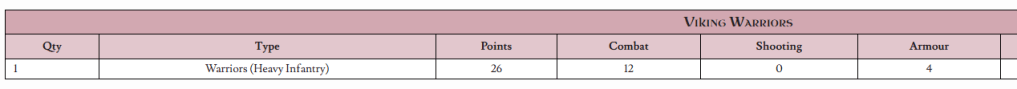 This doesn’t look great. Even with a 3:2 ratio of Irish to Vikings, I doubt the Irish are pulling a win here. Given the uselessness of their shooting, I’d probably make them the exact same warrior profile, just with less armor. This would allow them to roll 12 dice, giving them a 60% chance of knocking wounds off the Vikings–but that may not be enough. Looking at some of the options available, I could bump them to hitting on a 4+ (Brutal) or give them two more dice while at full health (Spears as Tribute) which could help even the battlefield.