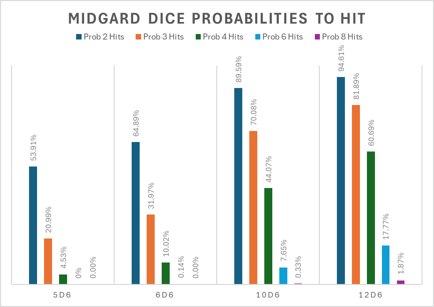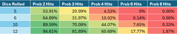 The Vikings will roll 12 dice at full health and 6 dice at half health. The Irish will roll 10 and 5, respectively. They hit on 5+, so let’s look at their probability to hit at some relevant values: