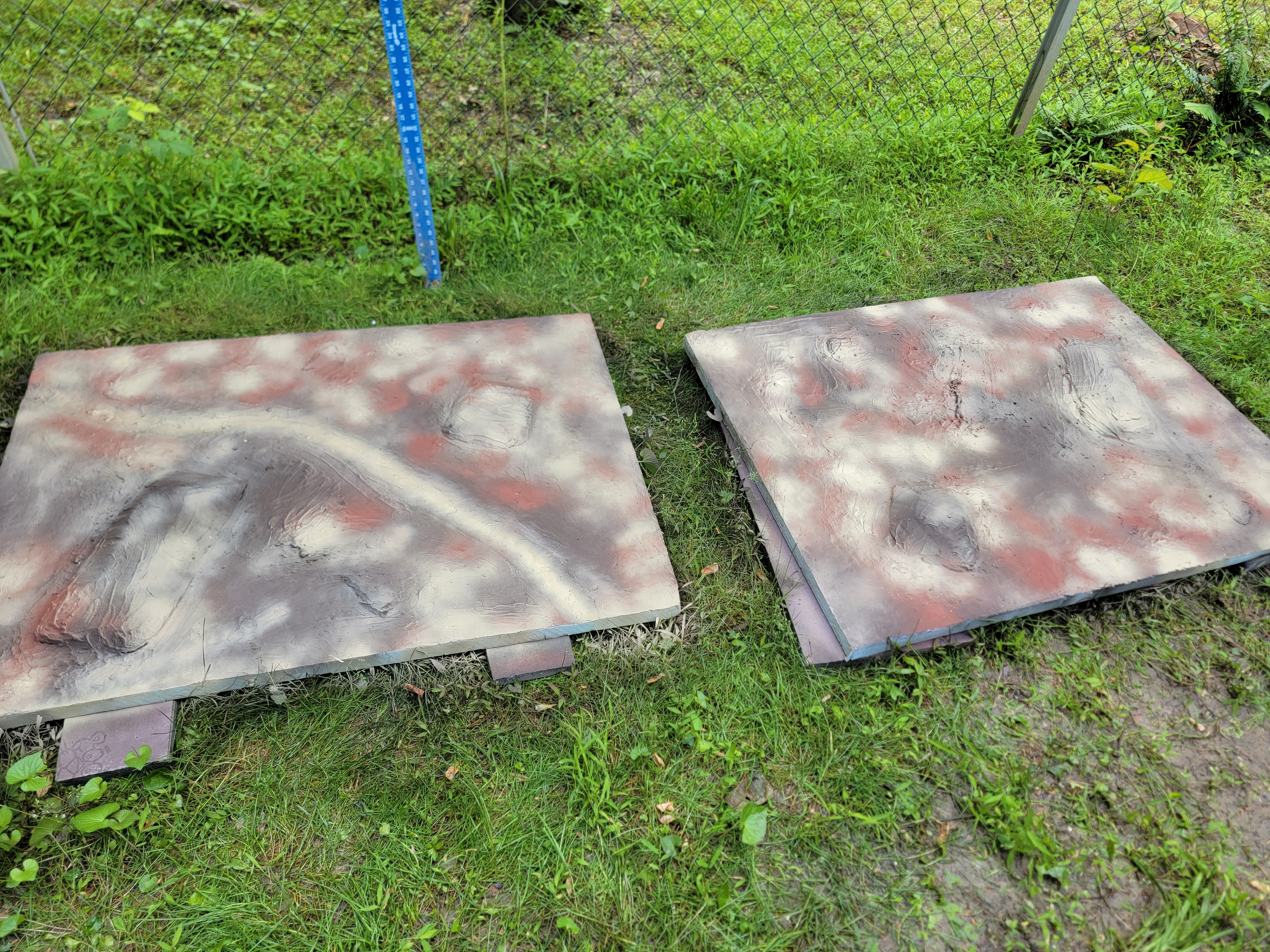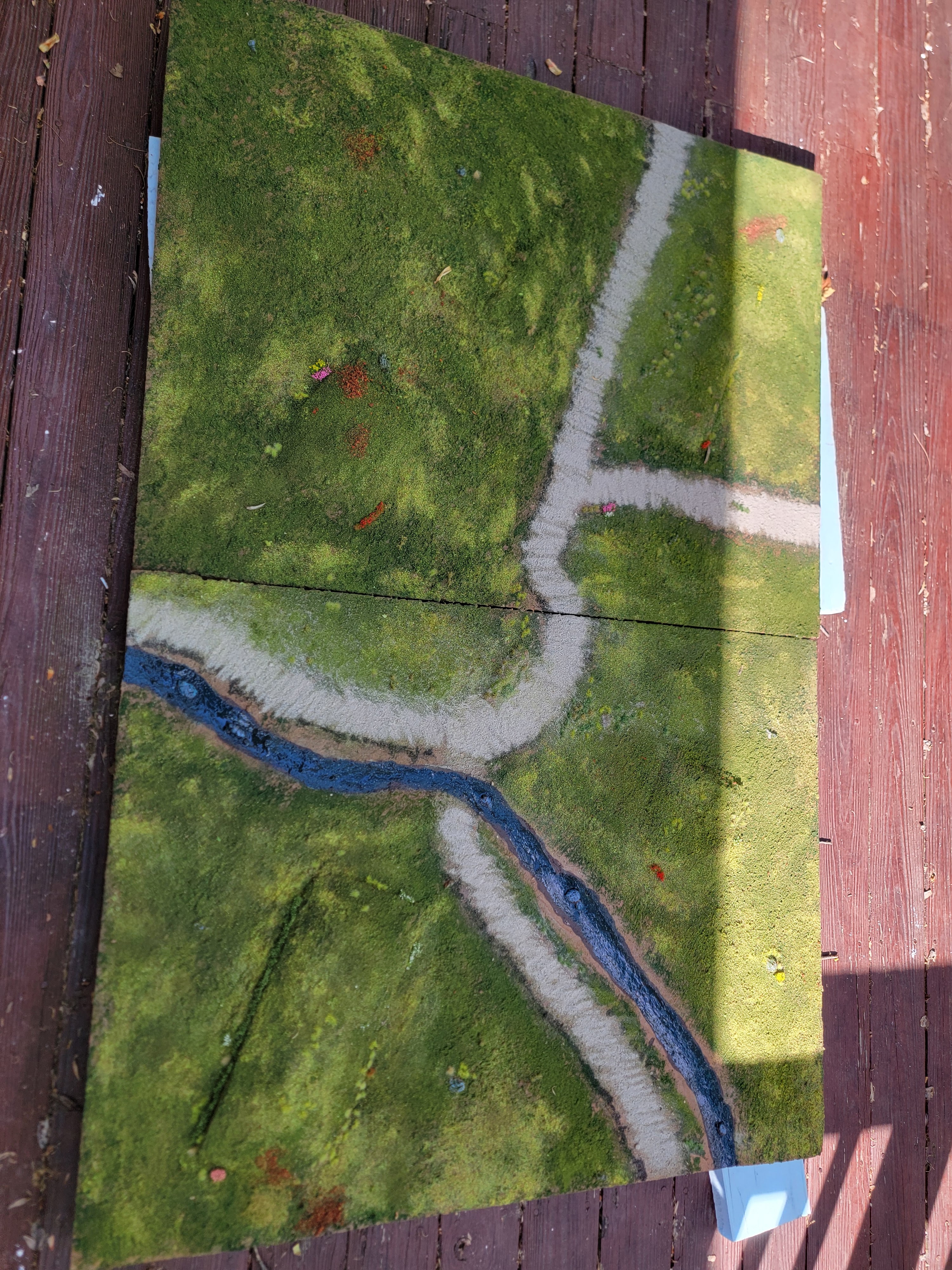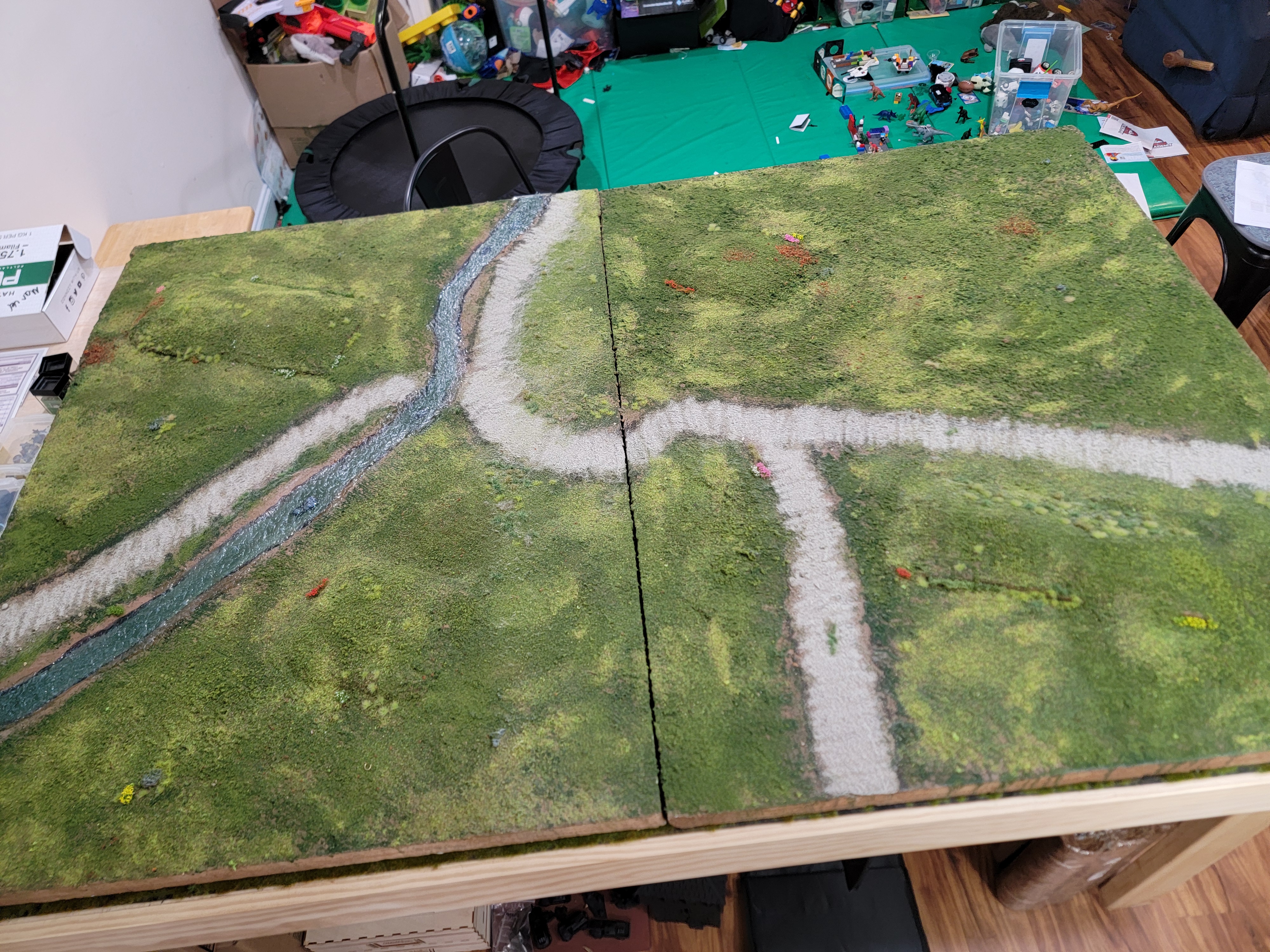 The board splits down the middle and I may make a foot wide river tile that slots in there. The roads also align from either side so as to maximize flexibility. I should be able to build a third board if I really want to. A good friend gave me several 8×4′ boards of 1.5″ insulation foam so I have more to work with.