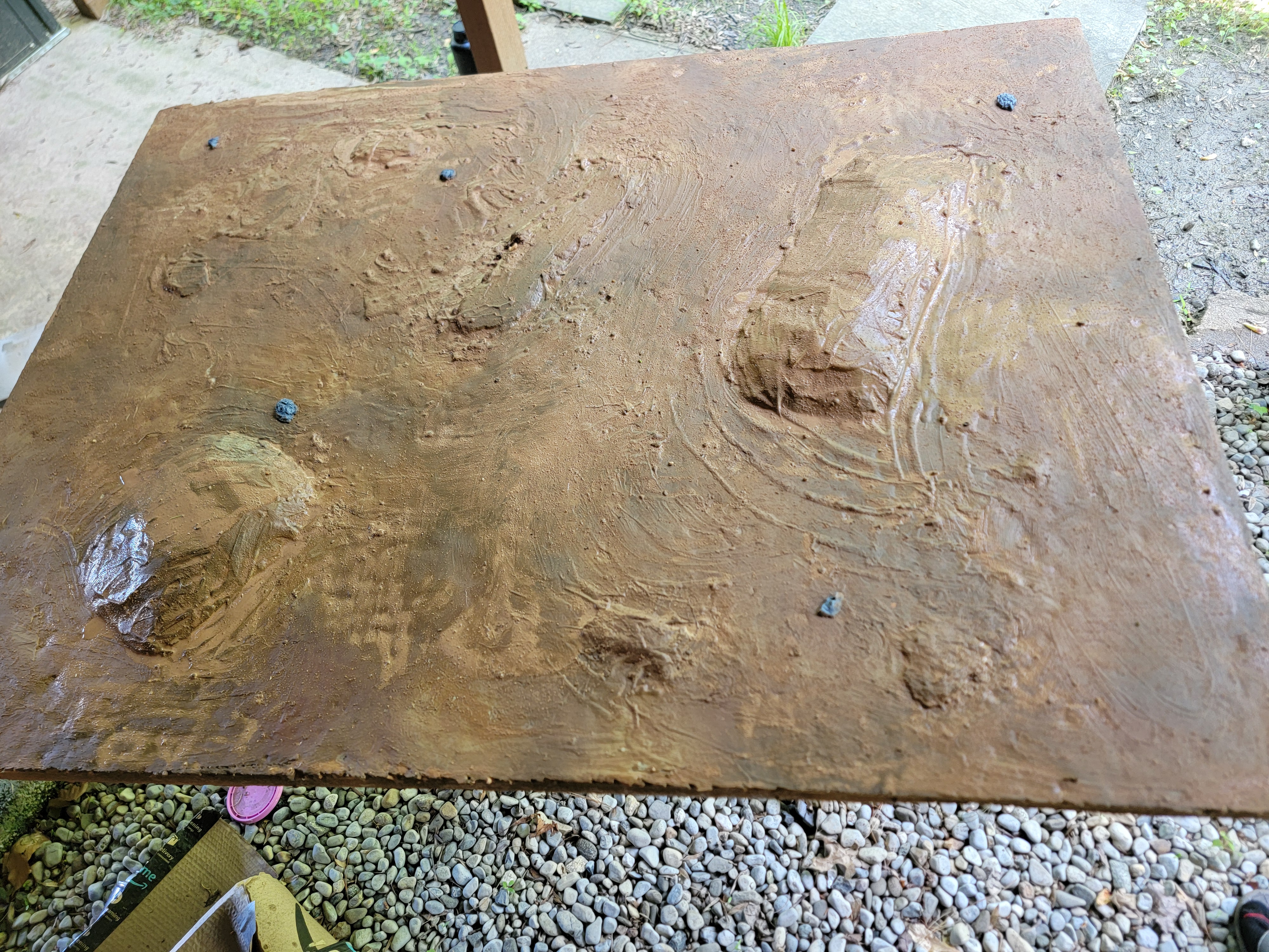 A few more details for the curious: I used Plaster of Paris to do the first layer to protect the foam before I hit it with various brown primers. Then I layered two layers of a mixture of sand, PVA, water, brown paint, and alcohol. This was followed by laying down the road and flocking. Had I used something more substantial than Plaster of Paris, I probably could have smoothed out my hills better, so I don’t recommend doing purely Plaster of Paris. It just served as a cost effective method of protecting the board. The subsequent layers of glue were necessary to reduce how brittle it is. The end result is a board that has now had miniatures and dice moving around it without any damage so far.