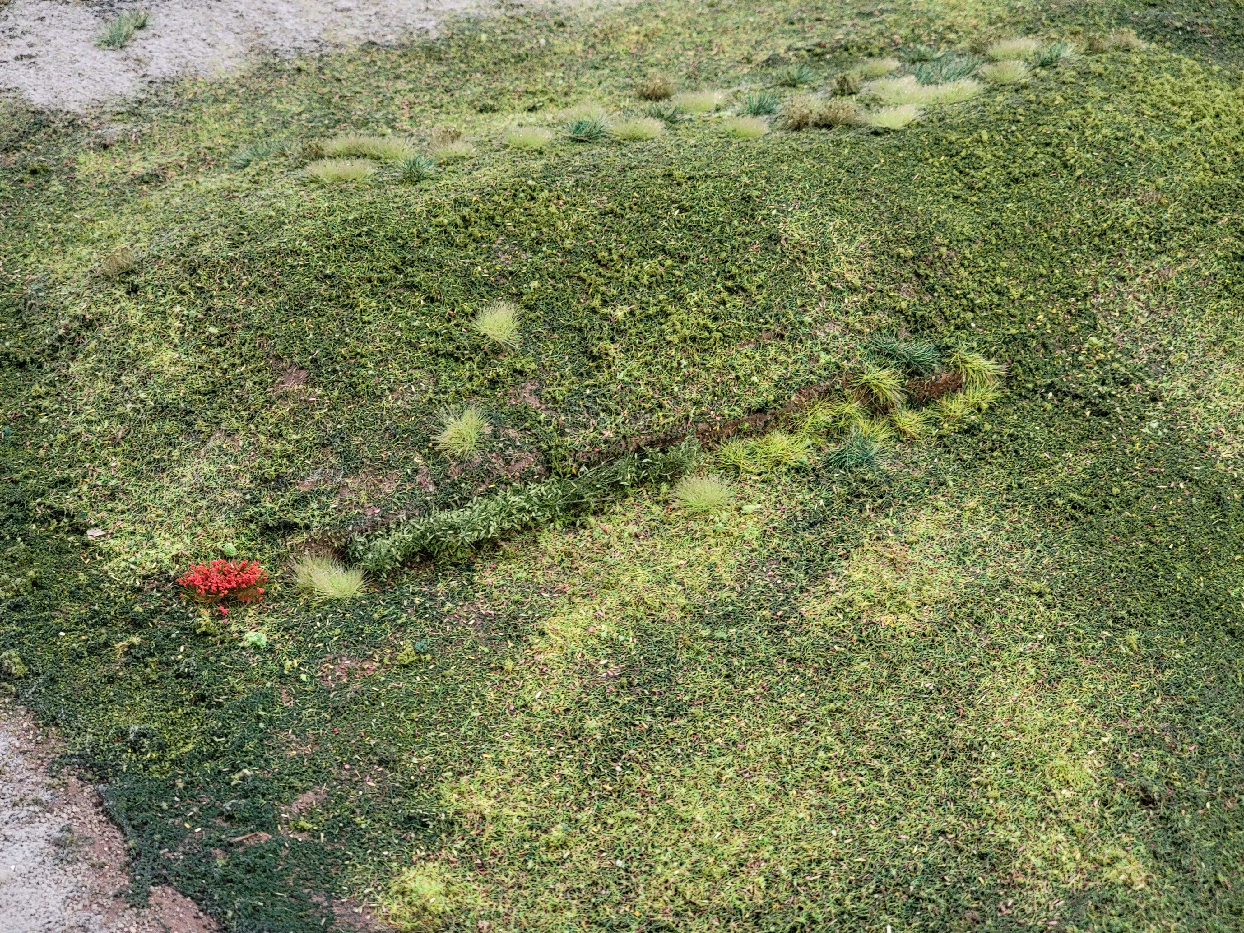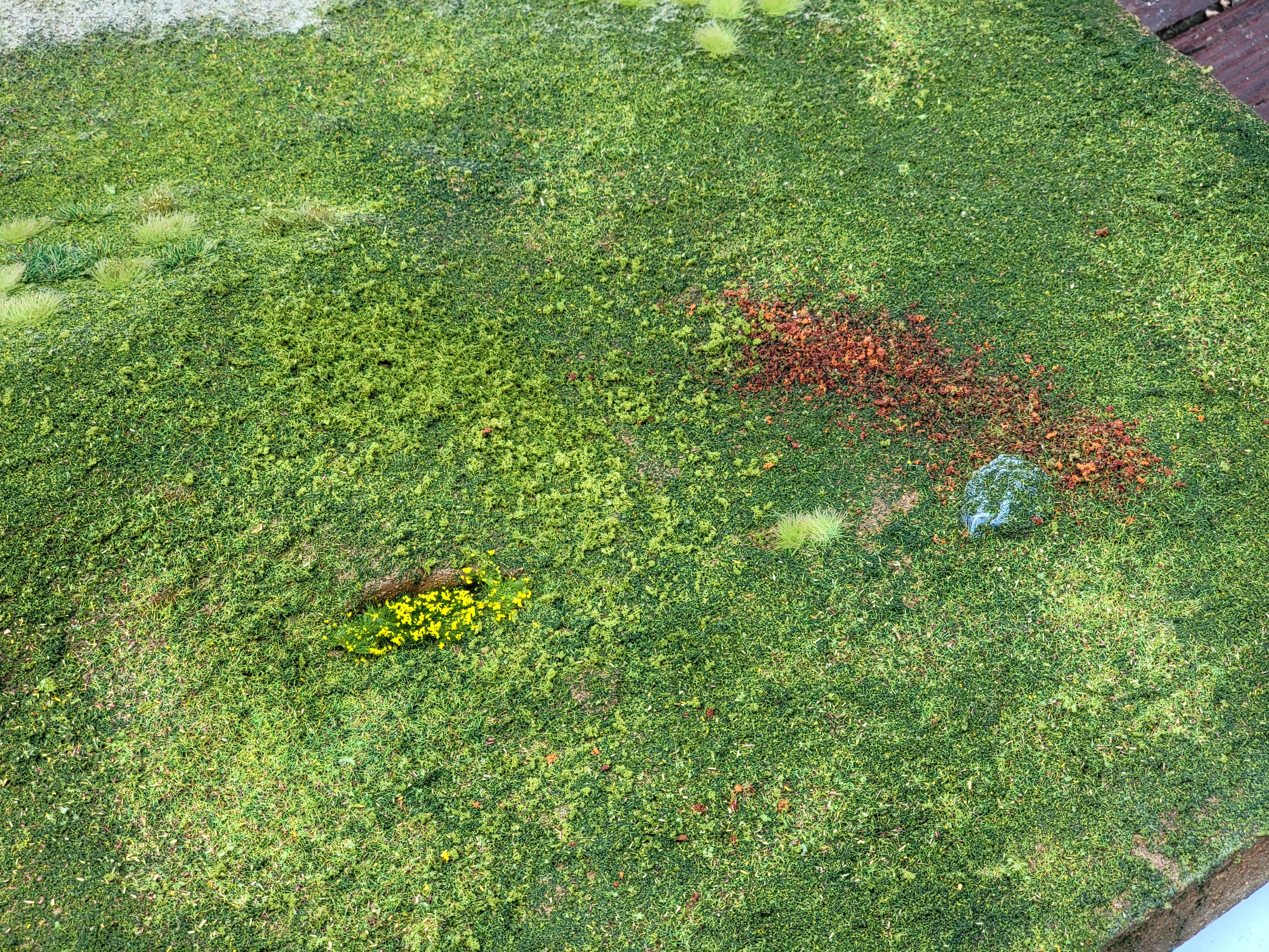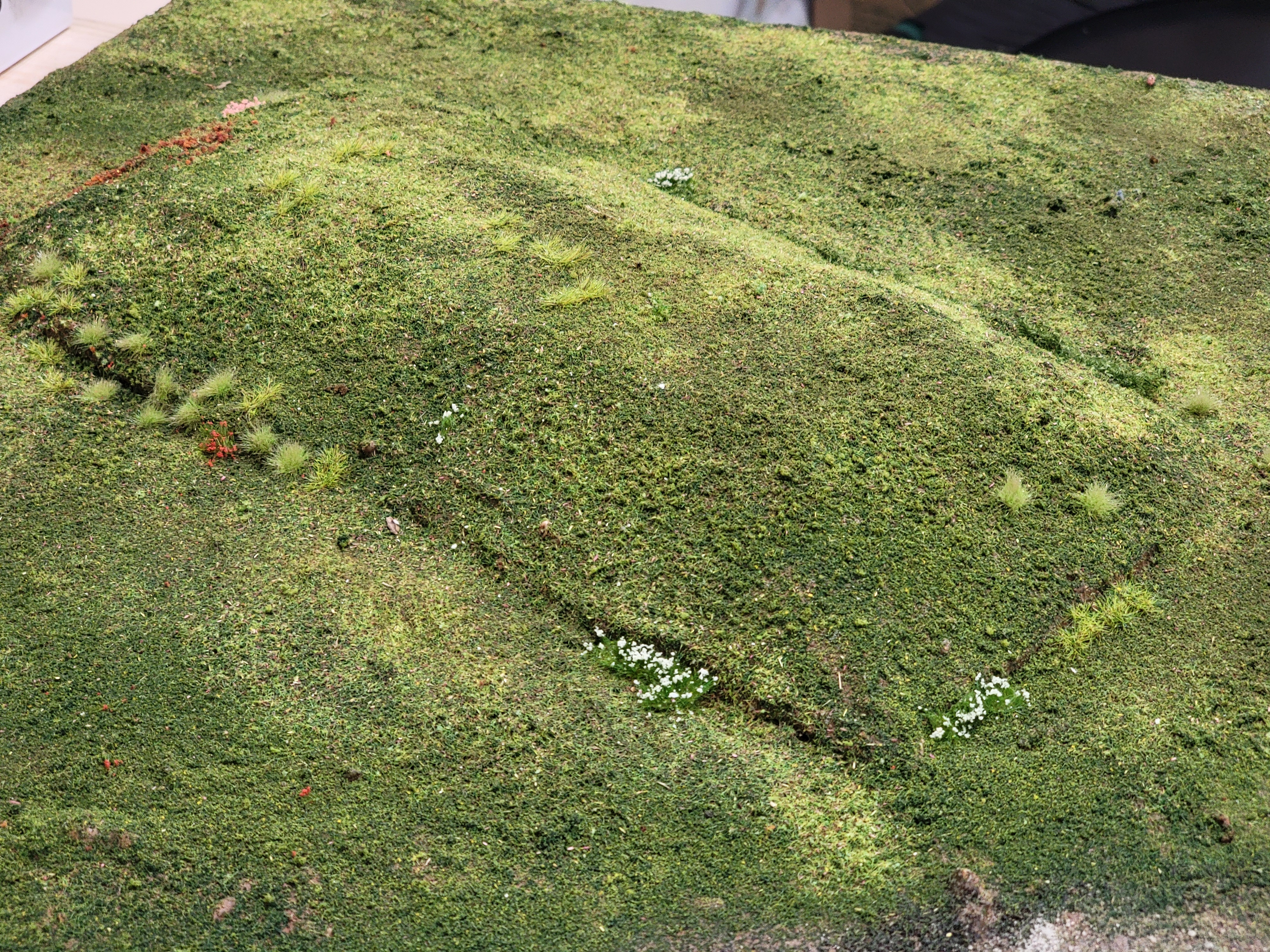 Ah well–it looks good in the end and I can take the lessons forward to the next time I build a giant board. Failures aside, the rest came out great. The ground cover was accomplished by repeatedly layering, soaking in glue, and layering even more flock. I hit the first layer with high pressure bursts of glue which caused the flock to bunch up nicely. That wasn’t intentional but it led to an uneven and bumpy surface cover that looks good. Add to that a few rocks I scattered and a bunch of tufts and variably colored flocks which came together to make a fairly idyllic layer of countryside.