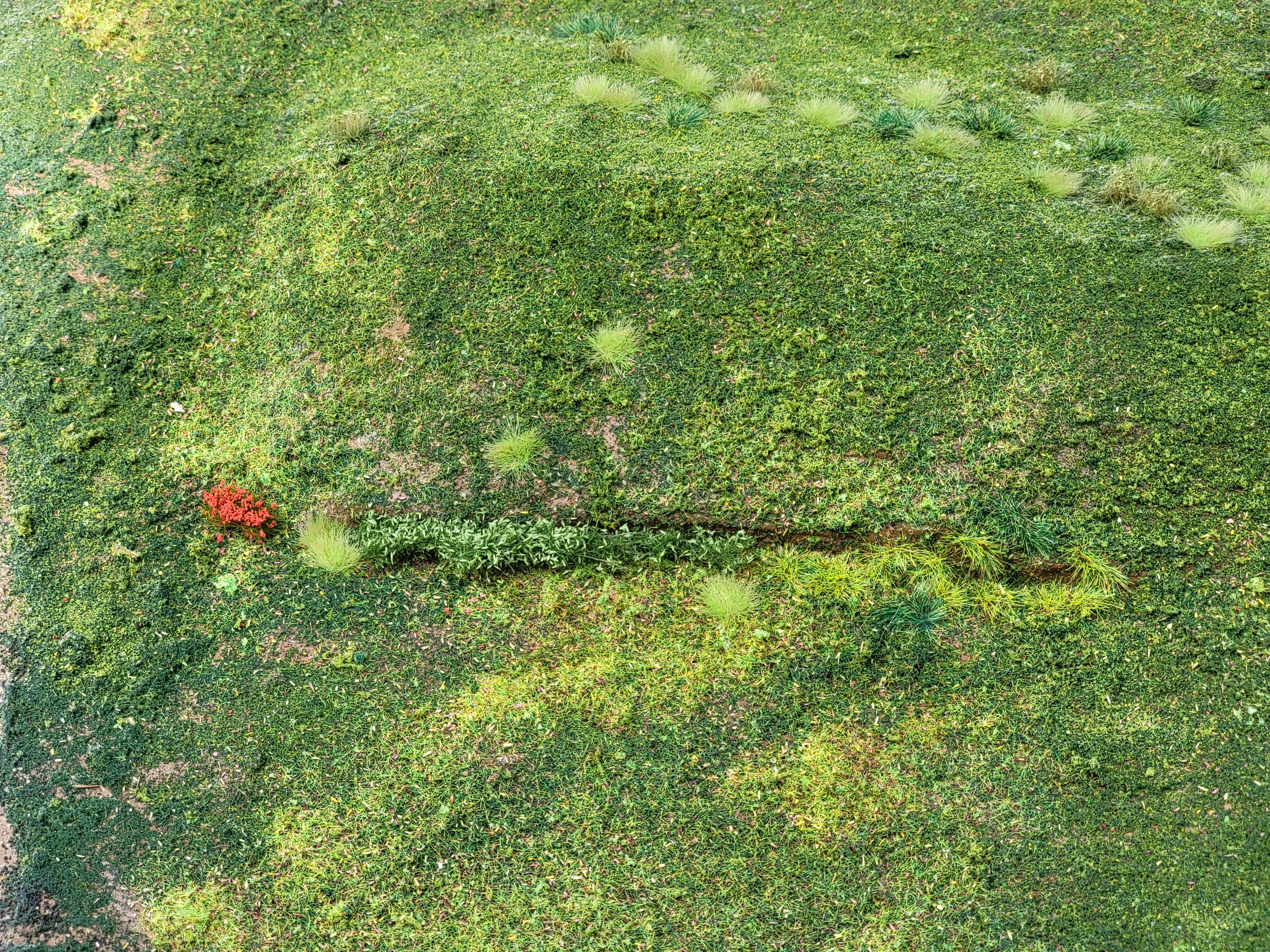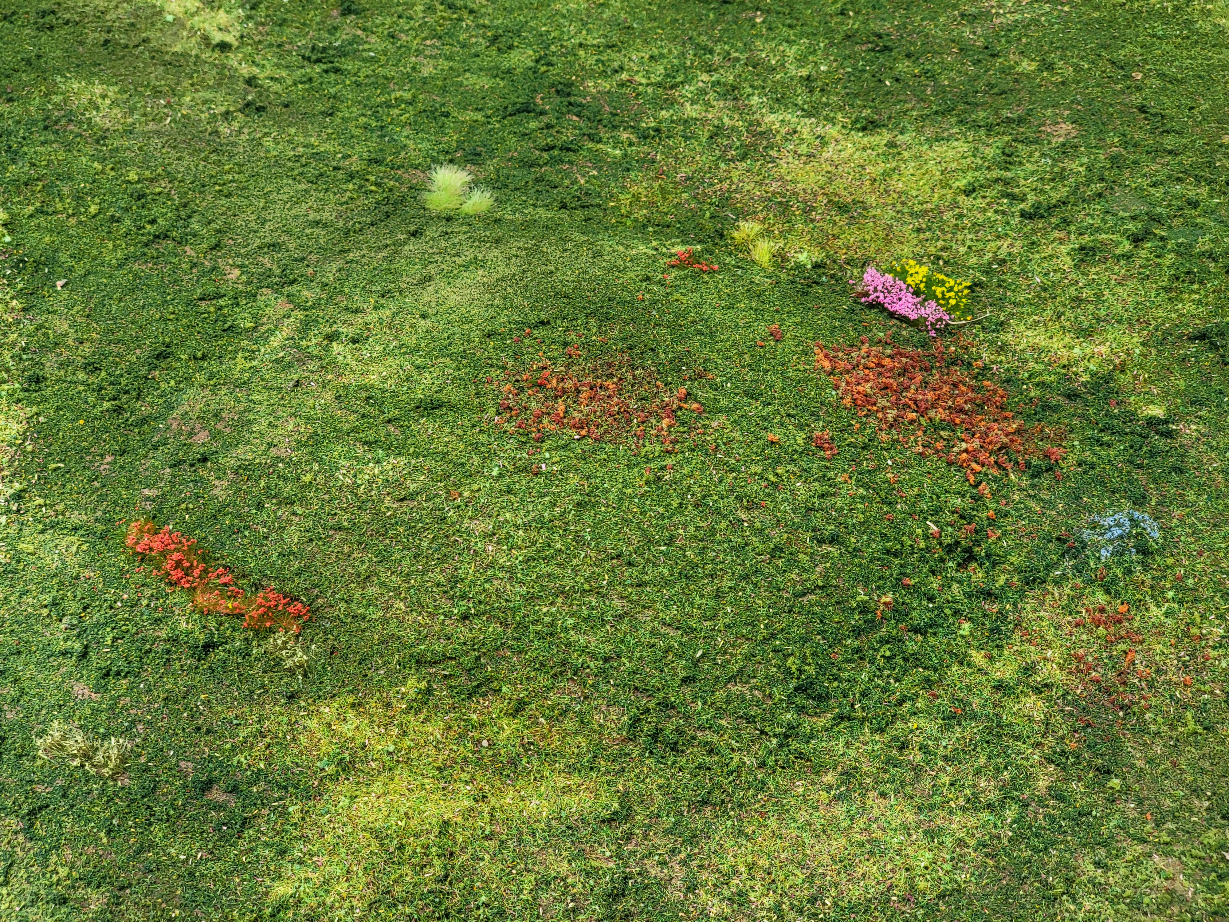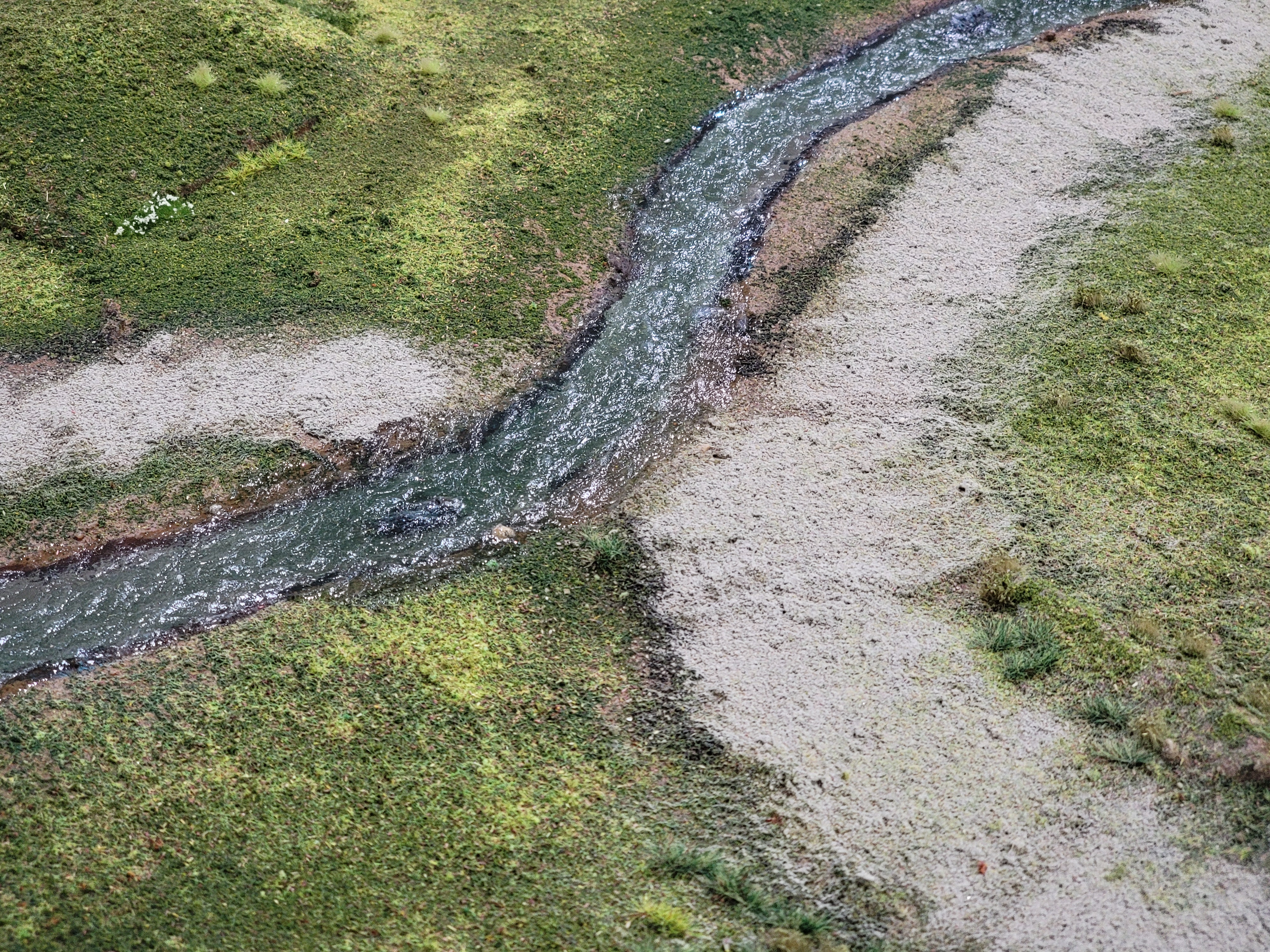 Ah well–it looks good in the end and I can take the lessons forward to the next time I build a giant board. Failures aside, the rest came out great. The ground cover was accomplished by repeatedly layering, soaking in glue, and layering even more flock. I hit the first layer with high pressure bursts of glue which caused the flock to bunch up nicely. That wasn’t intentional but it led to an uneven and bumpy surface cover that looks good. Add to that a few rocks I scattered and a bunch of tufts and variably colored flocks which came together to make a fairly idyllic layer of countryside.