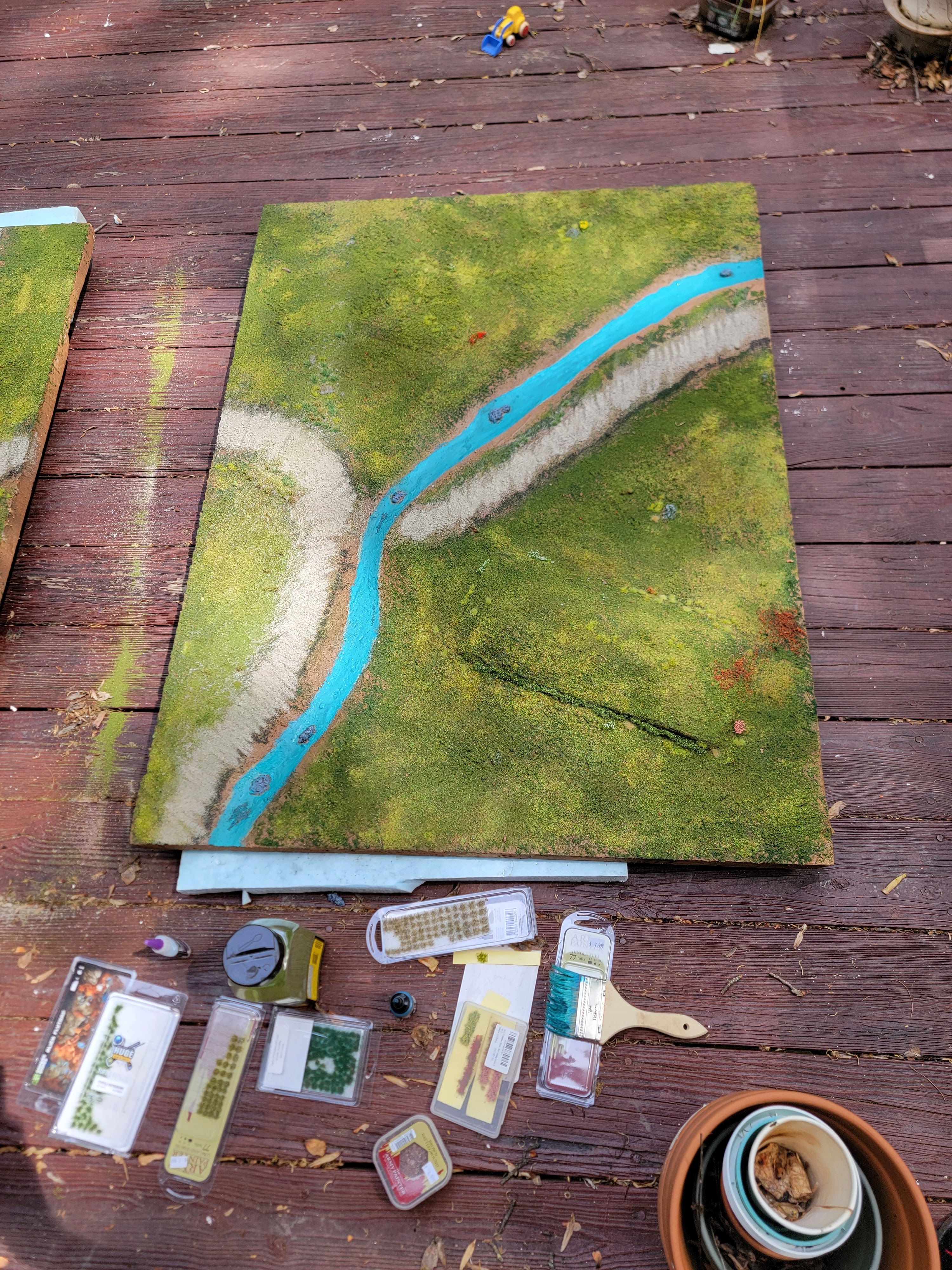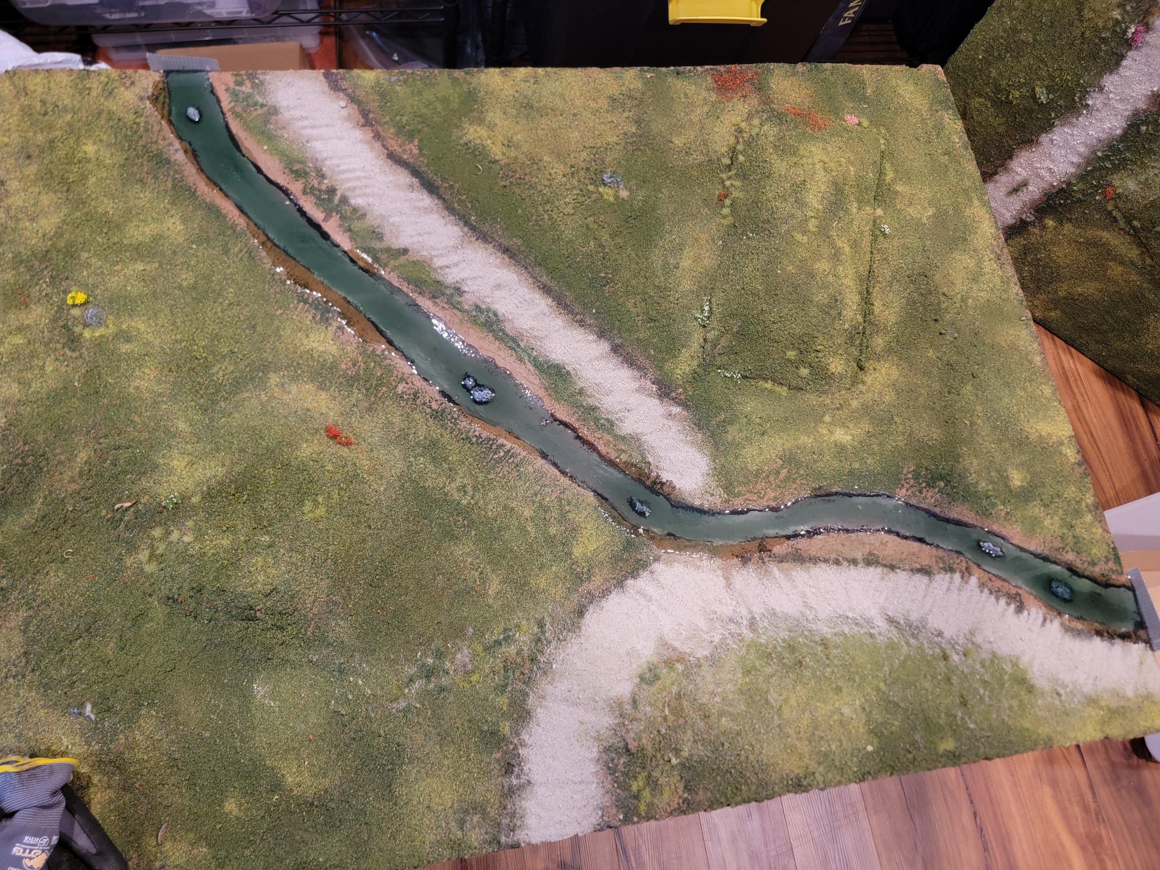 The board is playable, pretty, and should provide for a good showing at my club’s convention June 21st. Mission accomplished, even if I could do it better next time. I’m happy I did it and reasonably proud. I’m even jazzed up enough to expand it (the large river, maybe another board). I don’t recommend this project for everyone: it took a lot of work, cost more than a neoprene mat, and demands now that I store it somewhere. If you have the time, storage, and currency, though, I think you should try building a board at least once. Or, you know, I’m just justifying my behavior.
