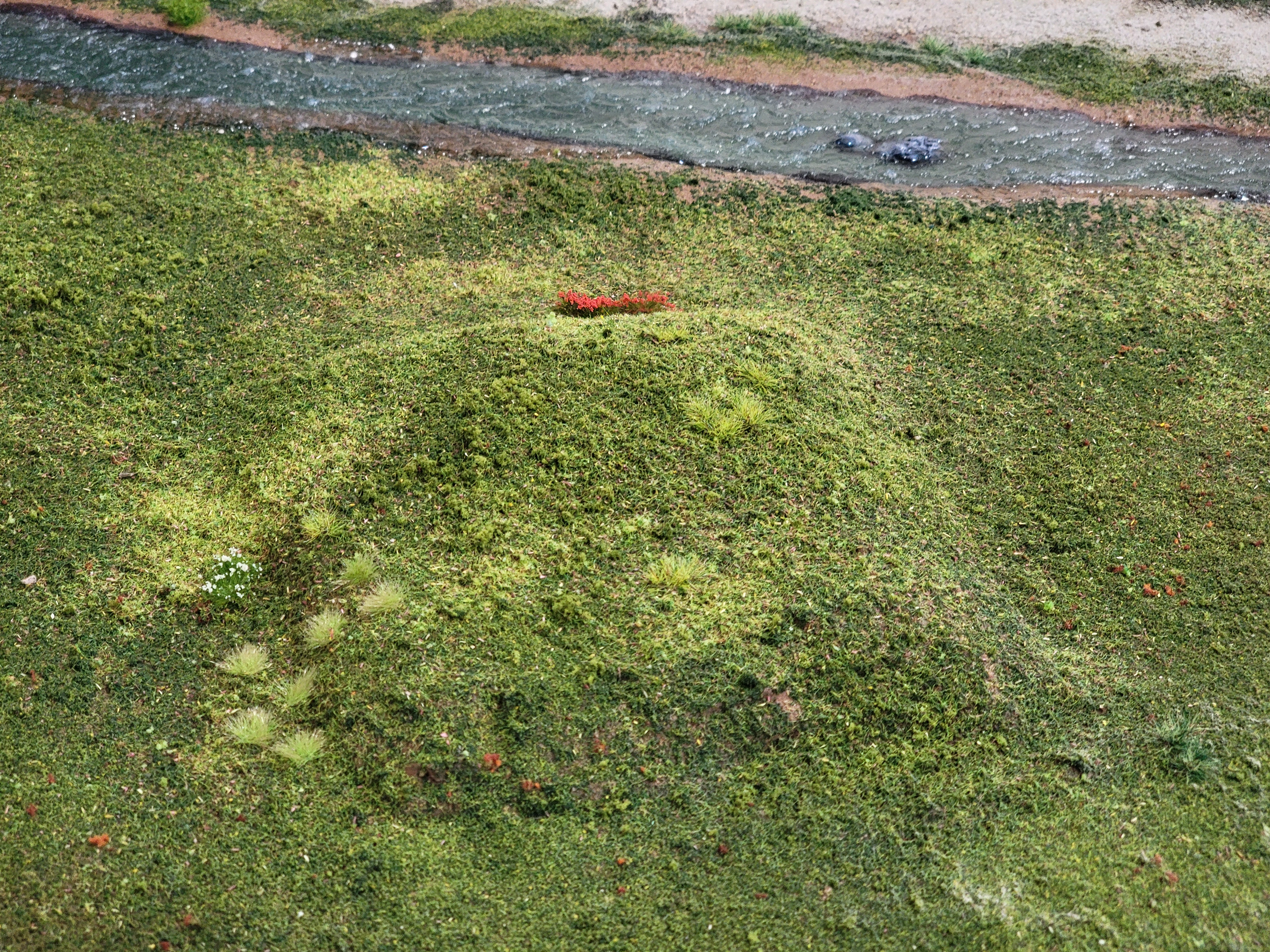 - Sand your hills until you’re tired of it, then walk away for a few hours, then come back and do it again. Emphasize smoothness in how they meet the ground. Or don’t do them at all and just do the small undulations–that’s easier and looks great.