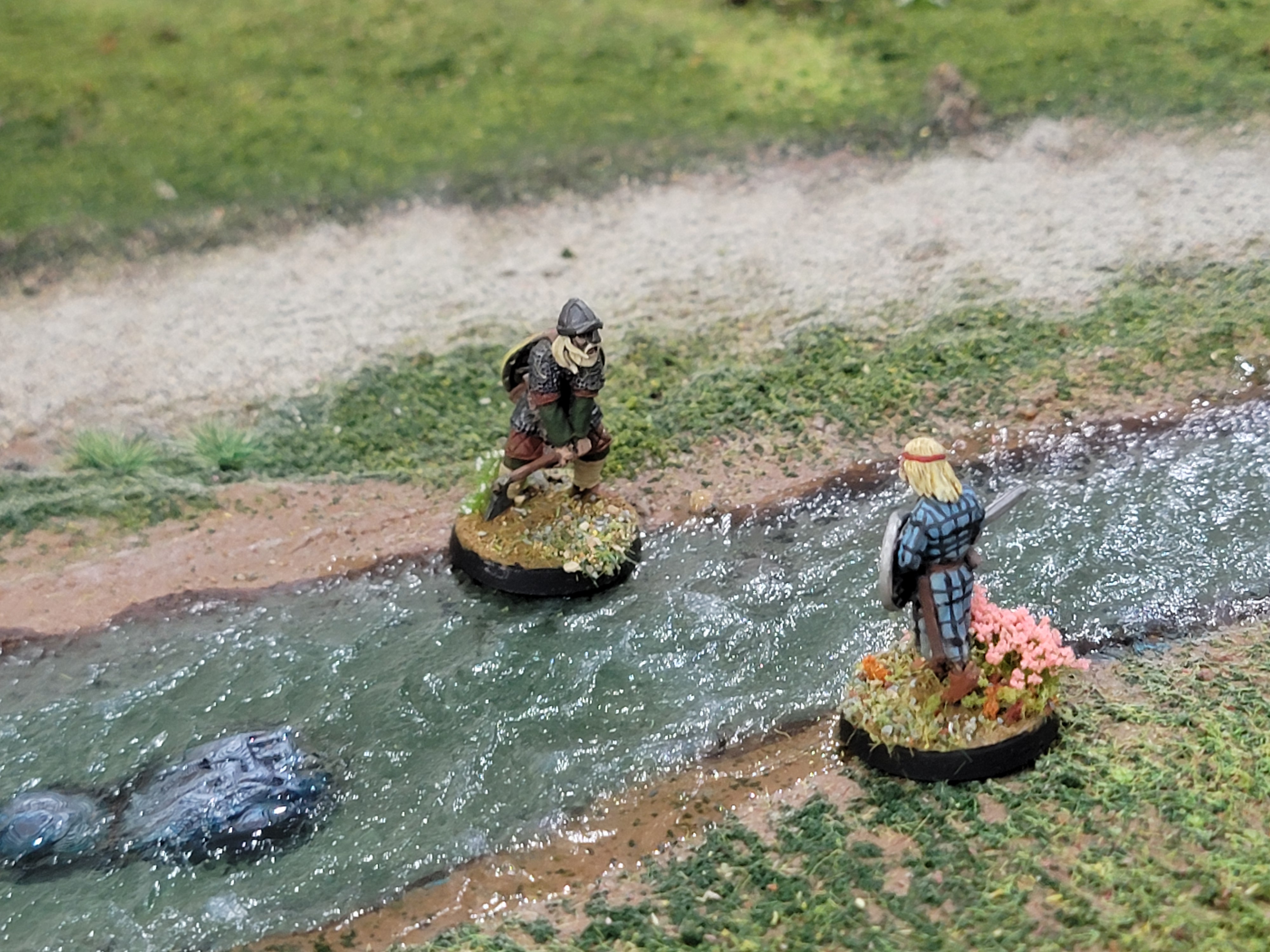 The river was a doozy. I spent a ton of time debating and repainting it before laying down the resin, settling on a dark green-brown color with a touch of blue (so perhaps teal). I poured the resin flat, then went back with a Vallejo surface effect to make it wavy and give the impression of moving water. I could have done this either way: the flat stream looked very serene and the moving water looks appropriately dramatic. I’m happy with the end result and wouldn’t change too much about how I executed it. There was no river or stream necessarily during the Battle of Clontarf aside from the one to the south between the Dubliners and Dublin. For the game we’ll count this as a stream with no real consequence, really just representing the local water flow toward a river.