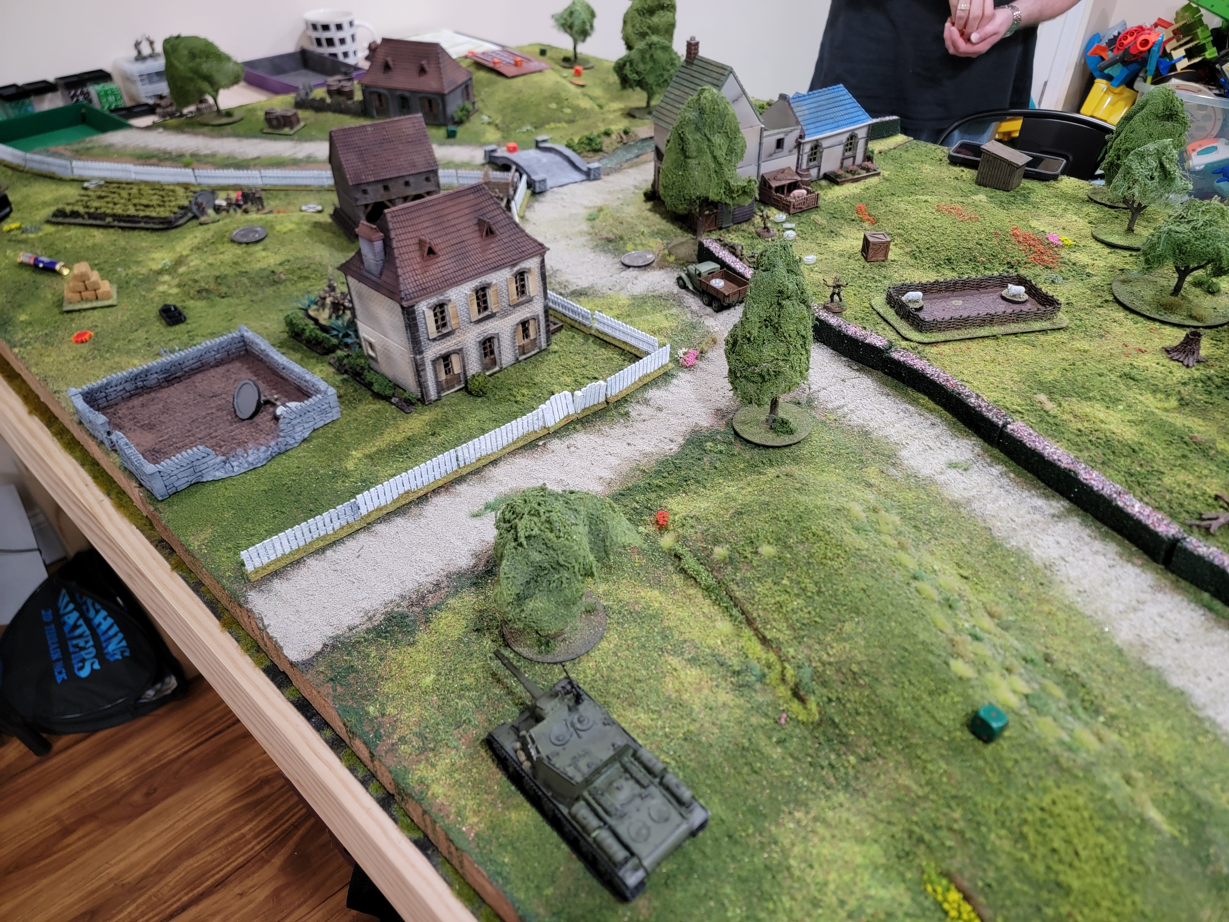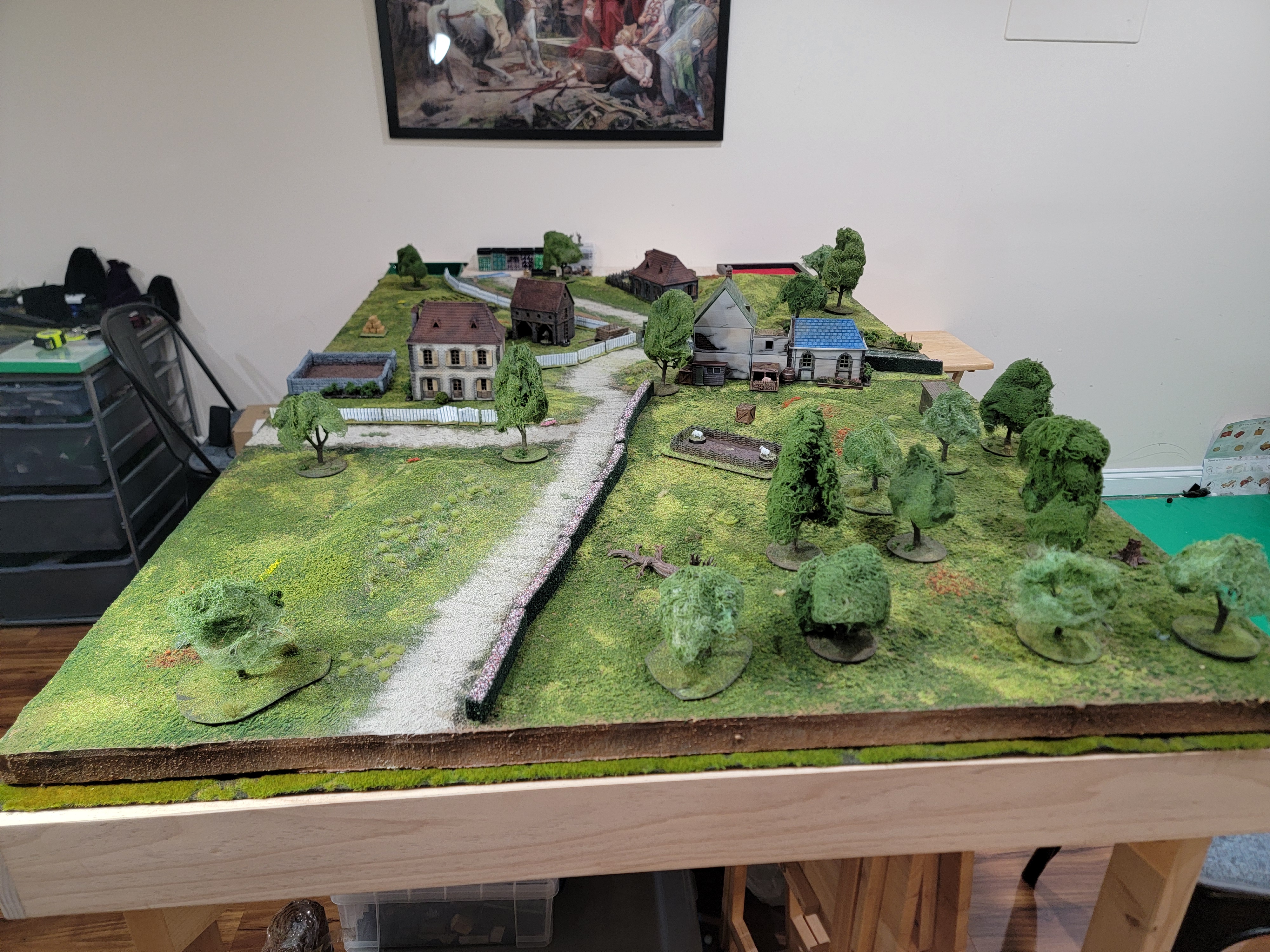 Finally, the other setups. I have set it up for a game of Age of Fantasy: Skirmish with my son later this week and I got my first game of Chain of Command 2 on this board (in short: fantastic–impressions coming). Setting up these buildings taught me one of the drawbacks of undulating terrain: it makes it hard to place buildings. In the future I’ll need to better consider where I want buildings to go so they don’t have corners hanging 5mm off the ground. On this board there’s only a handful of places you can really lay flat objects.