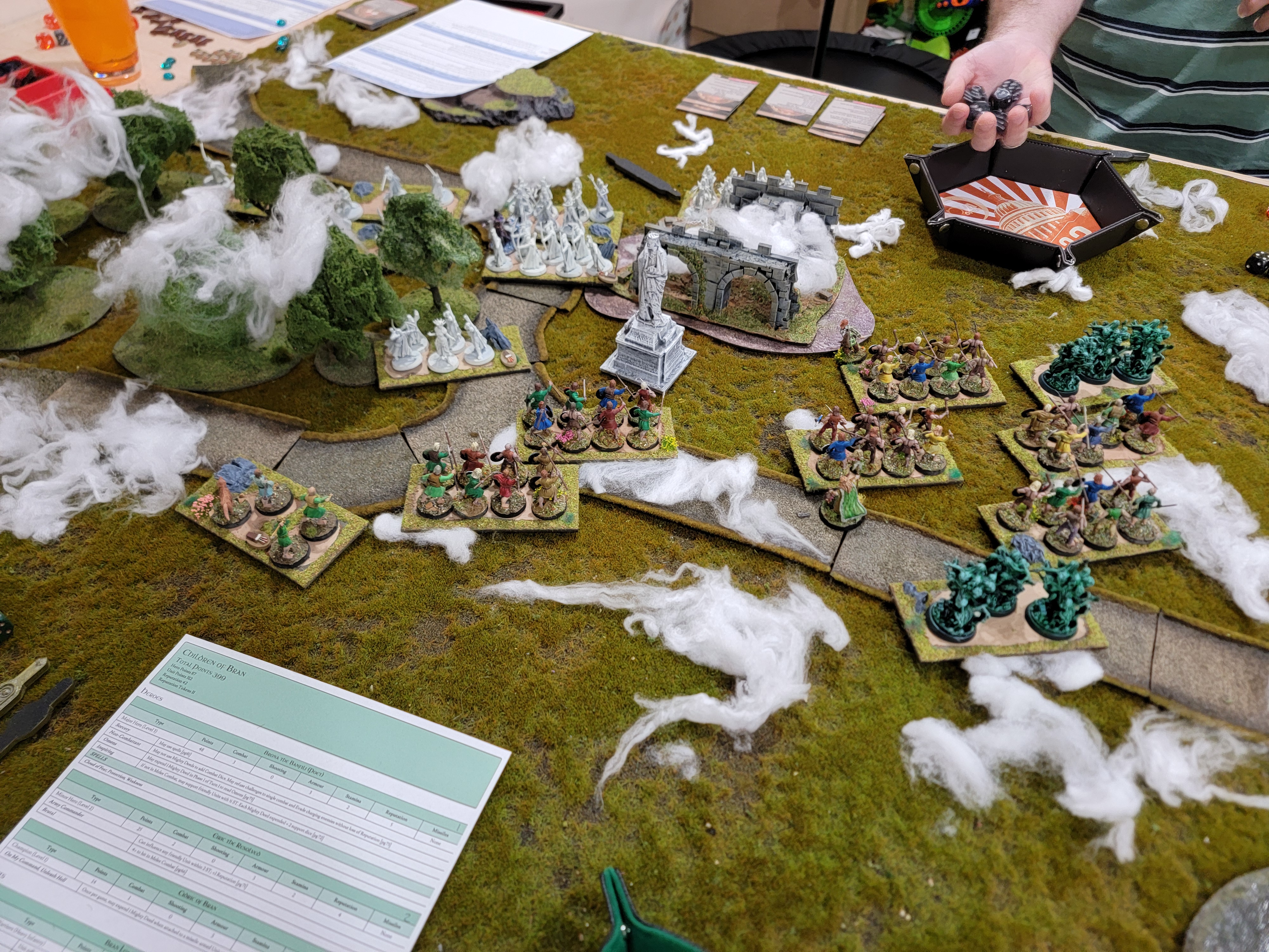 Too bad I failed to seal the deal. In retrospect I should have played cagier. See, the issue is the mist will clear at the start of a turn on a 5+ D6 roll. I spent the rest of the game positioning to capitalize on the mist clearing… only for the mist to never clear. It also doesn’t help that I decided to accept his obvious ploy to get me to fight in the middle of the rough ground of those ruins there. That, uh… may have been a particularly bad choice on my part.