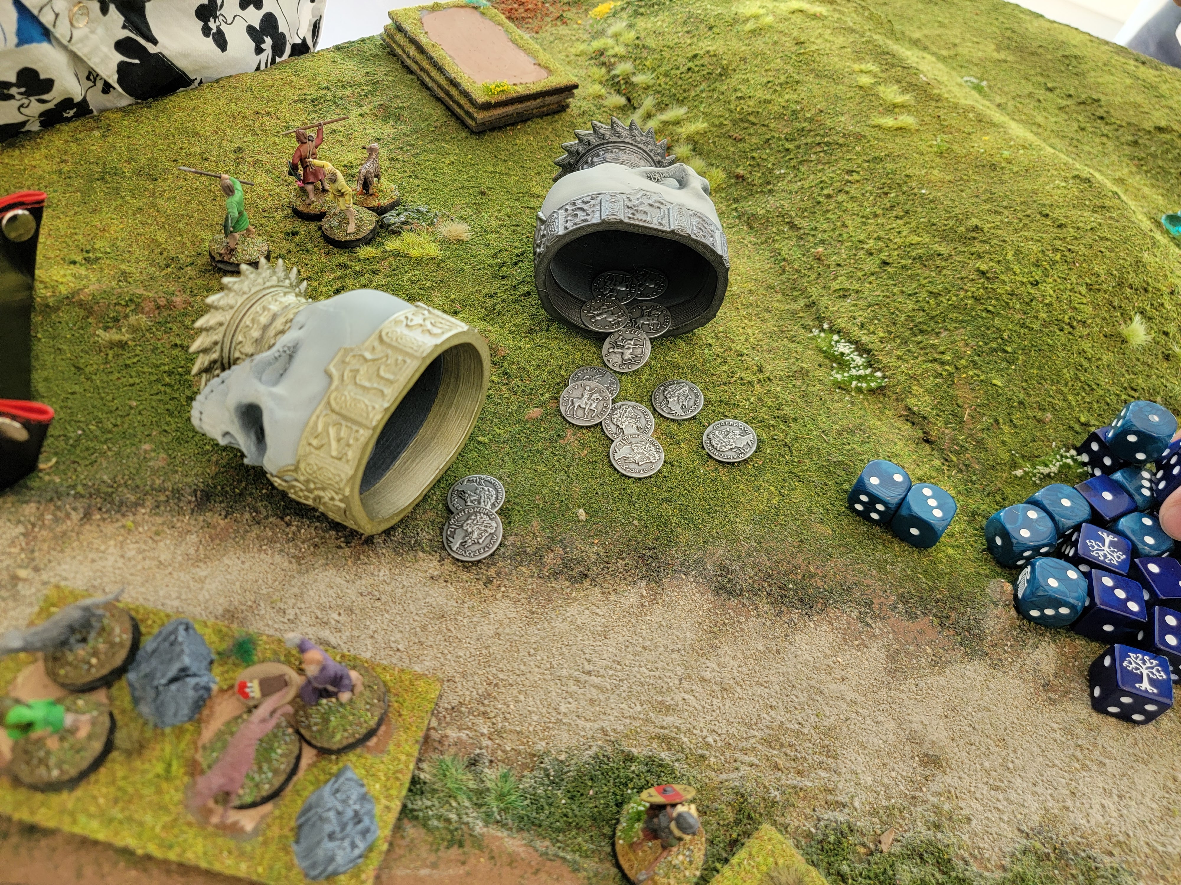 We had some great moments, like a duel between Ospak of Mann and Sigtrygg Silkbeard, which was actually not one of the objective duels. The players held on for each round as they rolled tie after tie, cheering each time. We had several people come over from other games to see what was going on as both men strained themselves through a difficult match, ultimately wounding Sigtrygg but not slaying him.