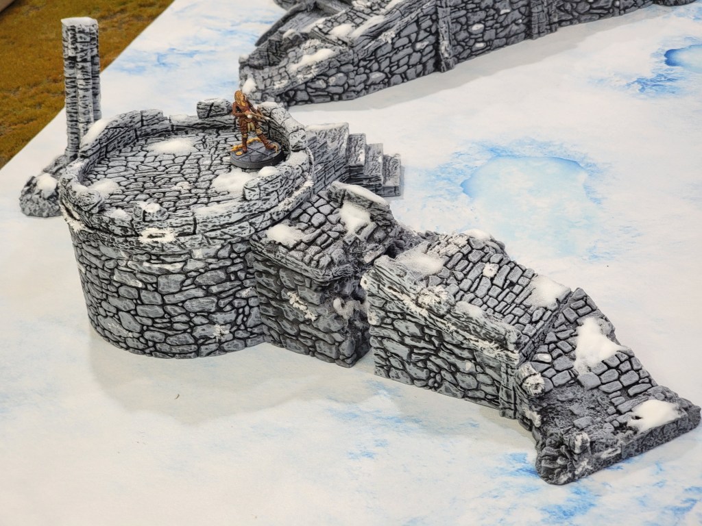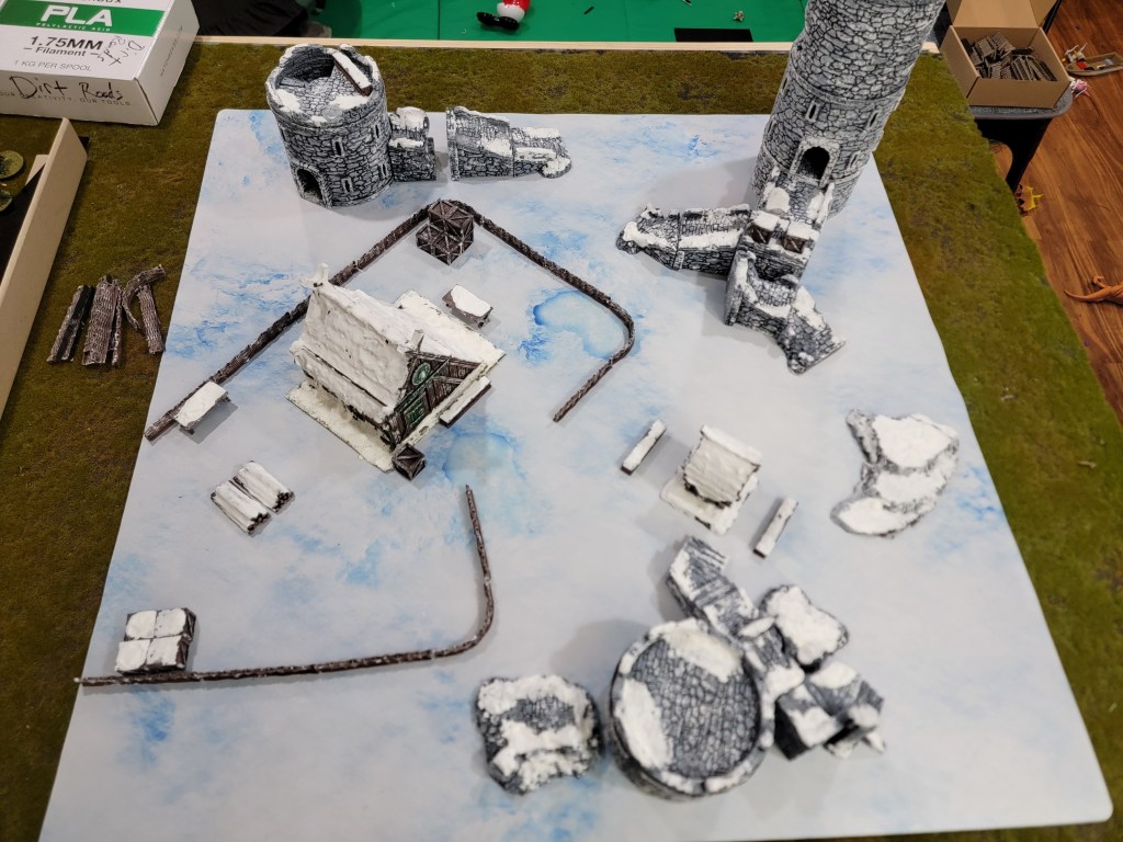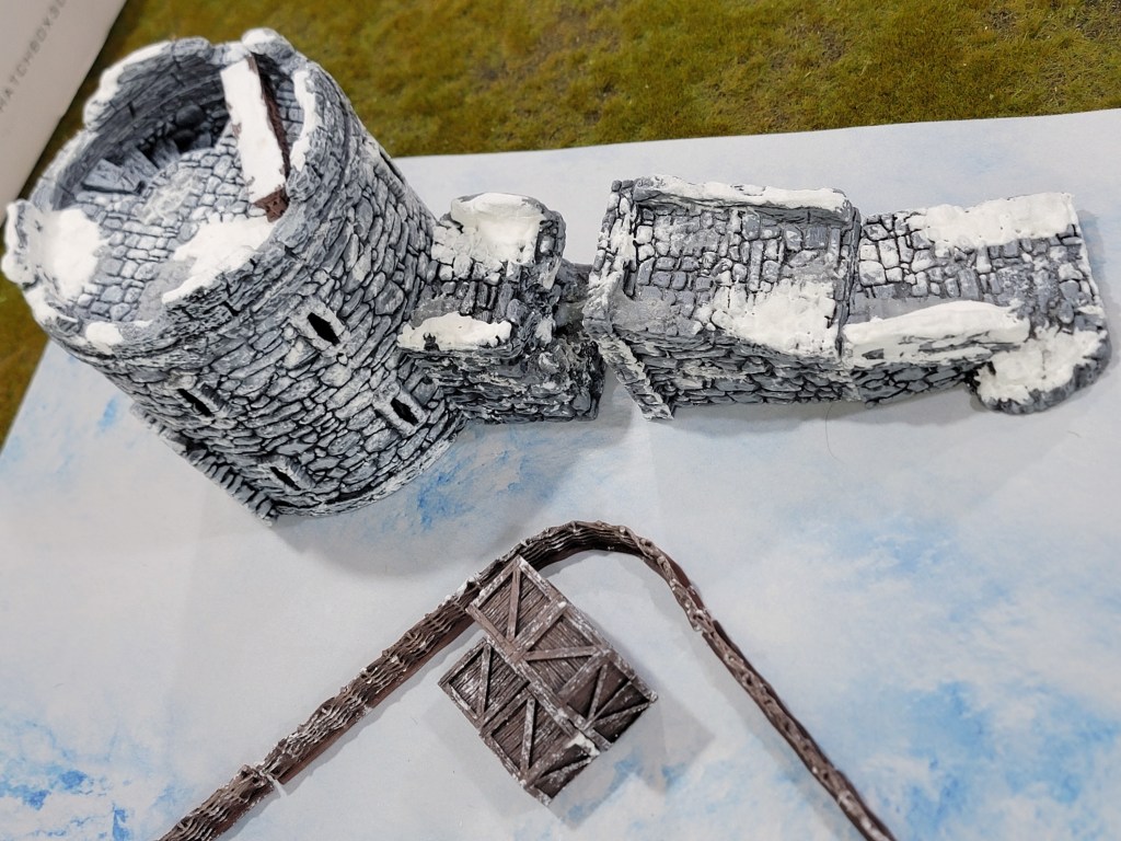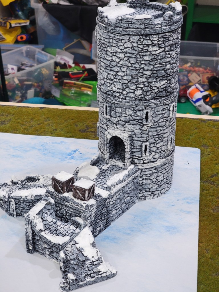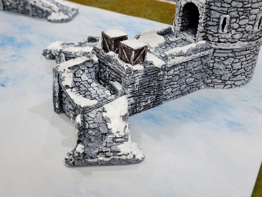 I think this looks far better. It took a while but was well worth the effort. Once I throw trees in I end up with quite a few layouts I could put on this board without ever repeating myself. I also have enough scatter and trees that this could just be a lone house in the snowy woods or it could just be the towers alone. There’s some flex here.