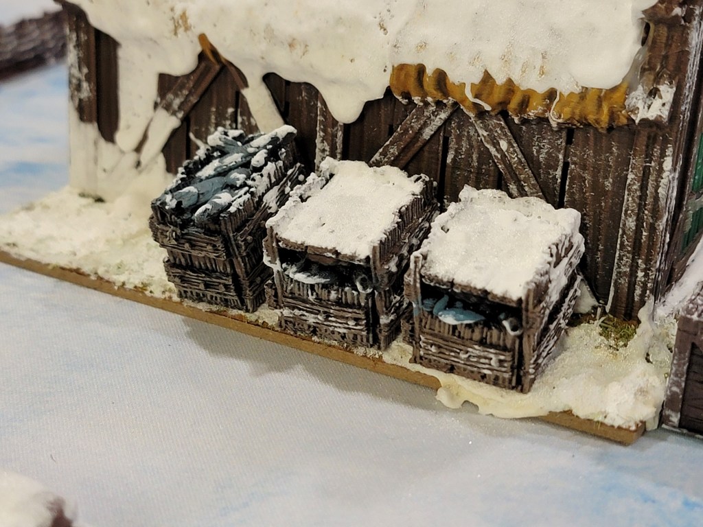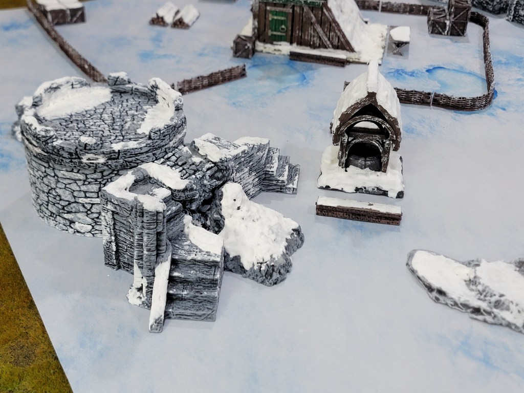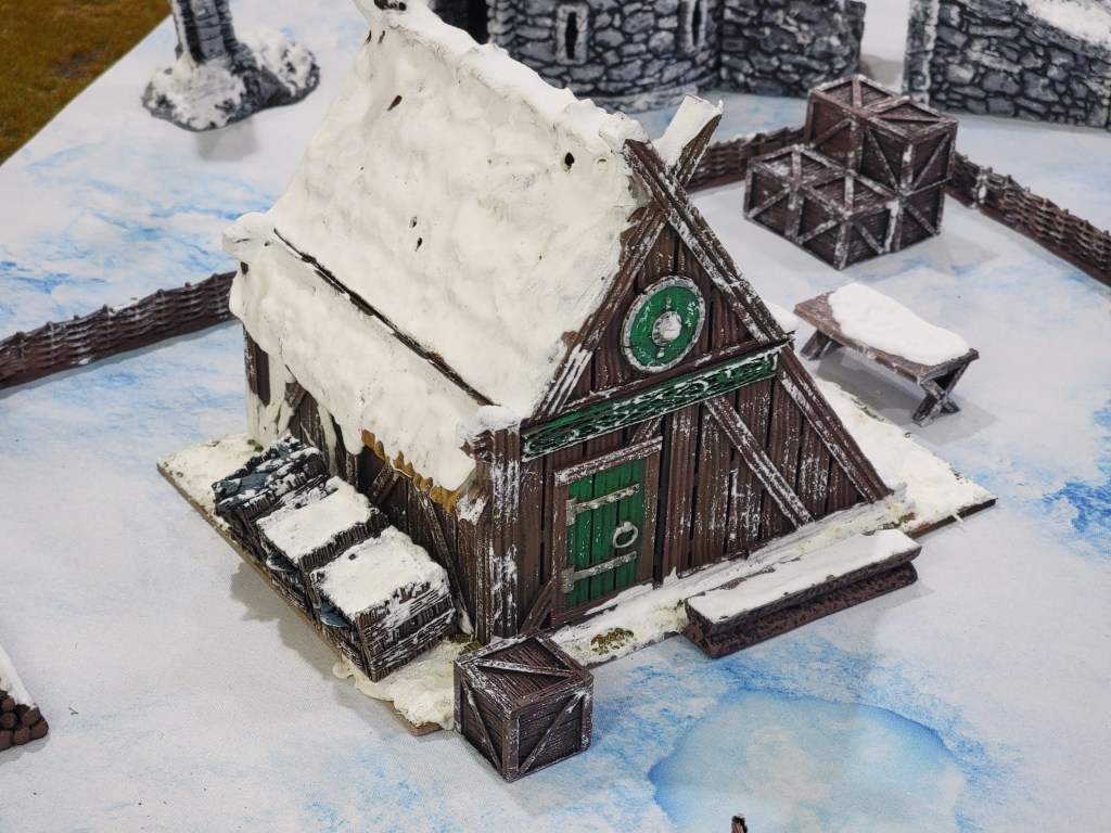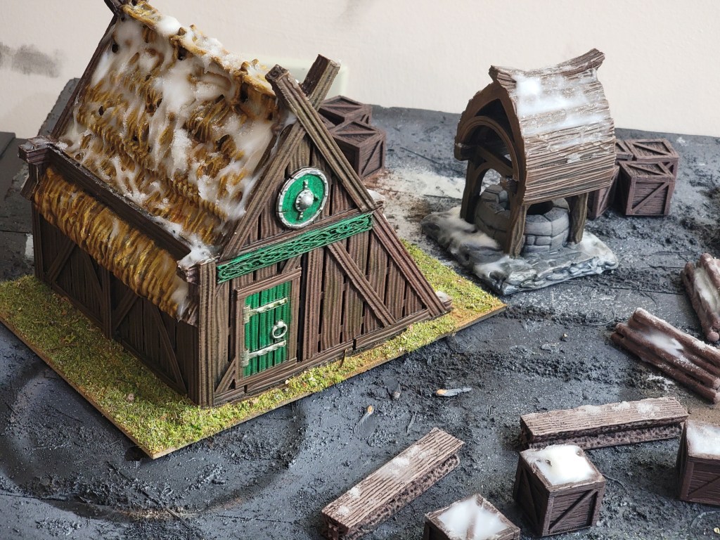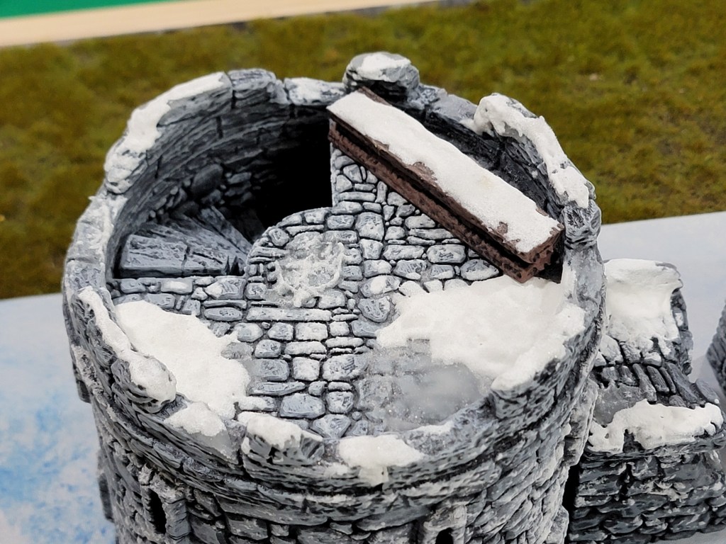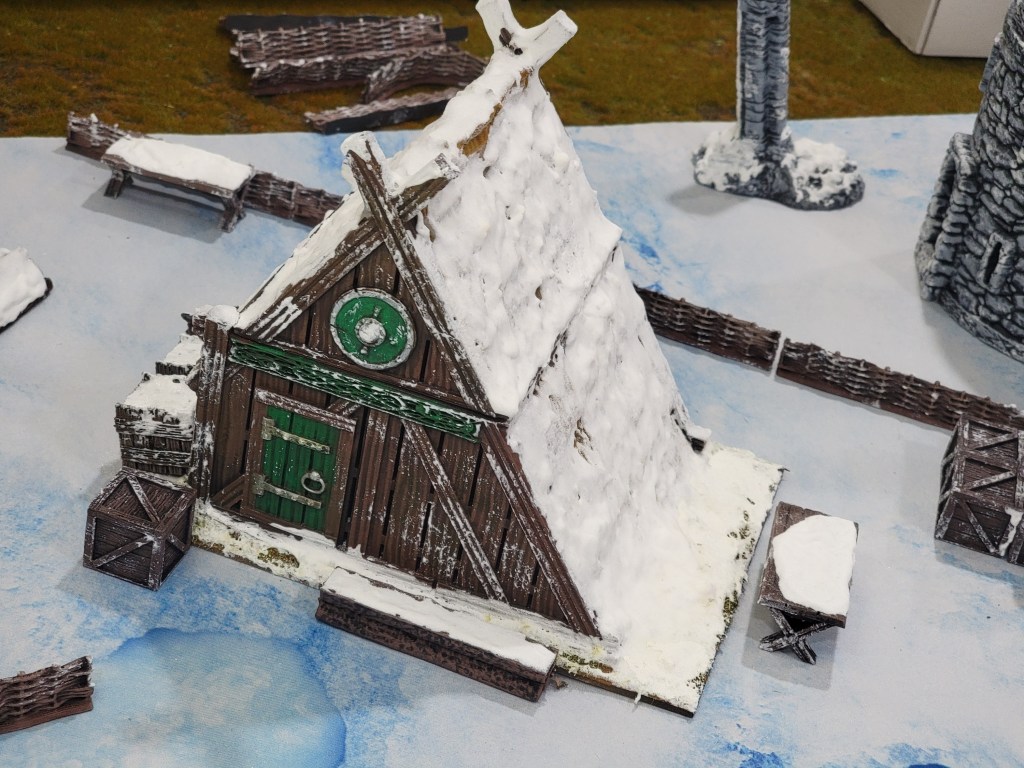 So I went about snowifying a viking house (link to the store, as I backed his Kickstarter to get this house and scatter) to put beside the tower.