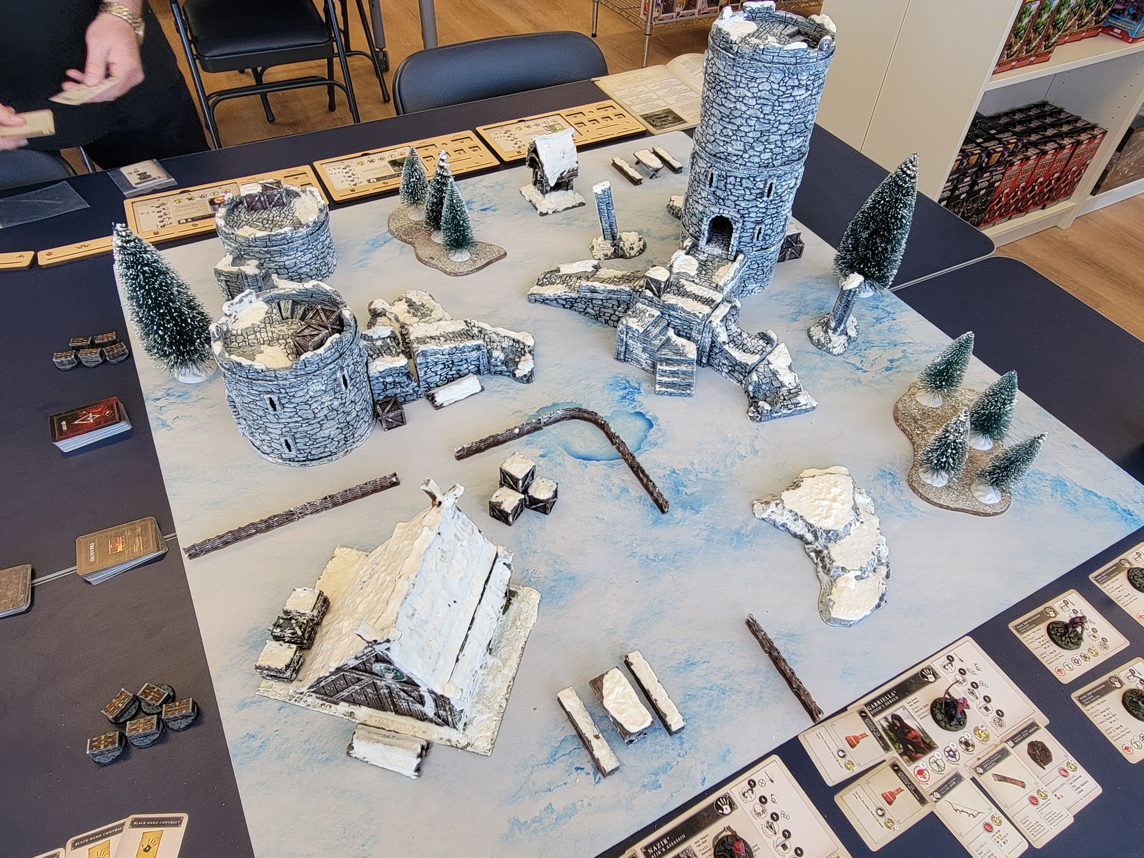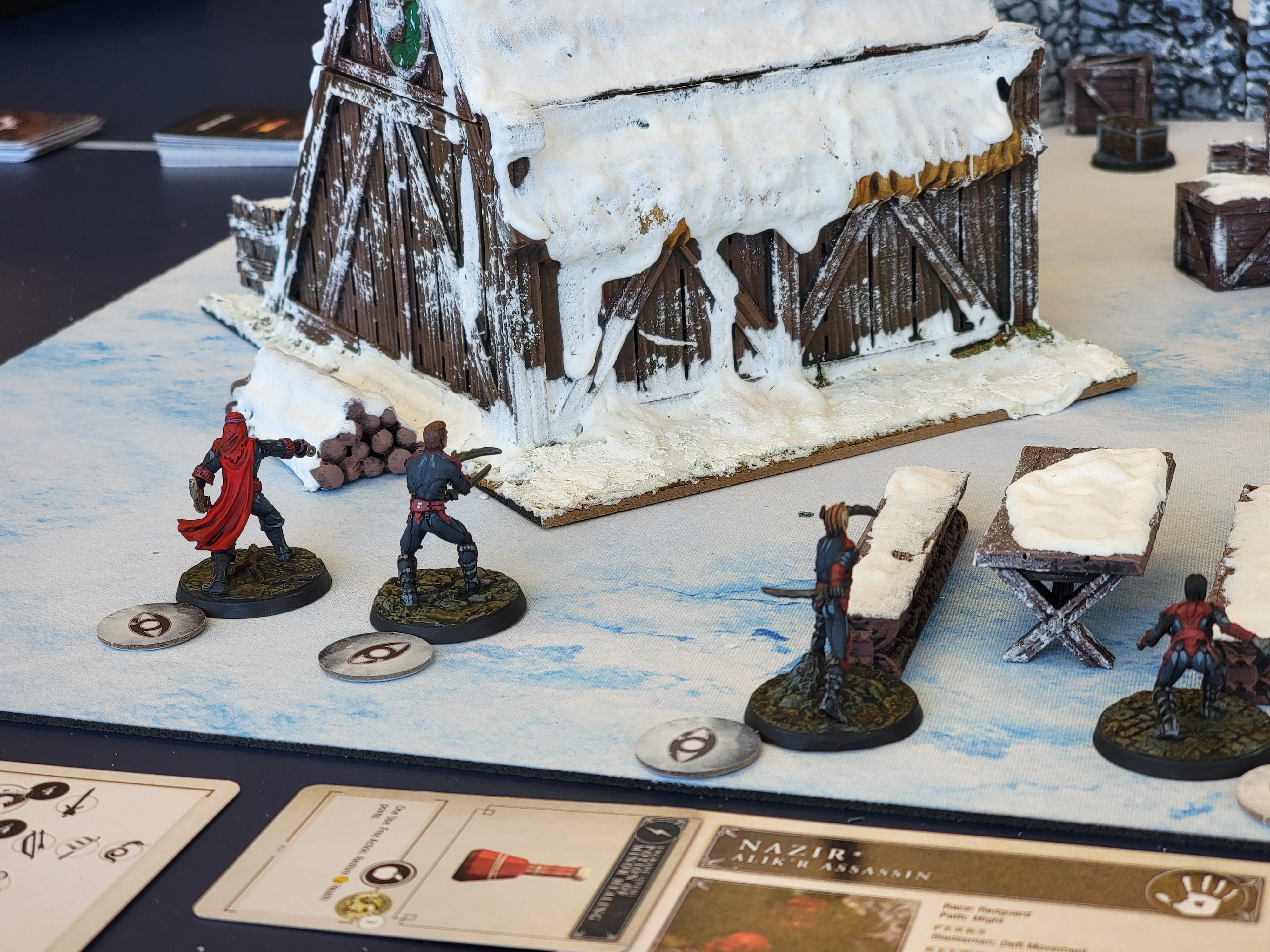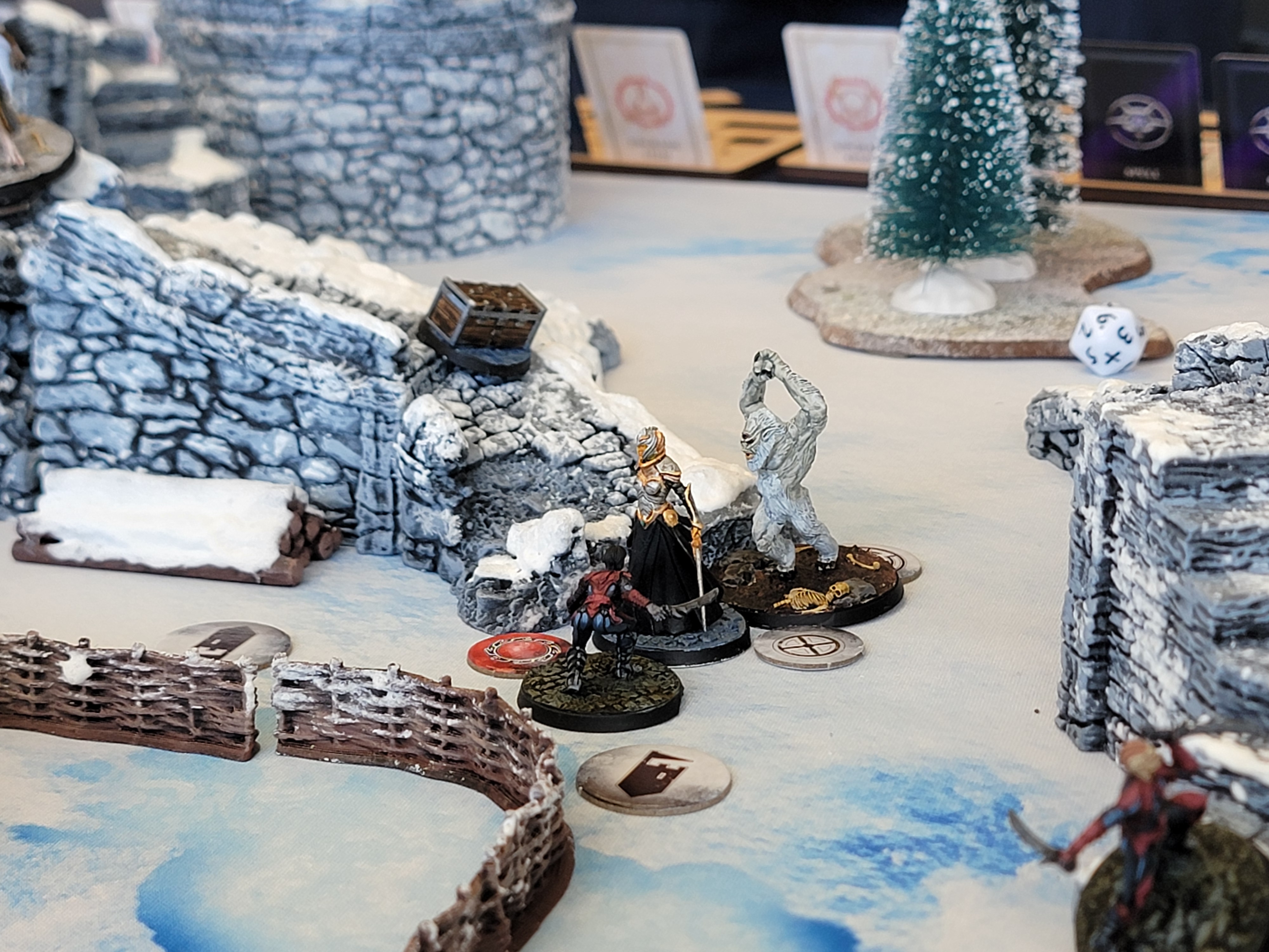 One archer missed every shot in the game and the other only killed the spiders. So much for solving problems. Thankfully, my efforts to flip objective tokens somewhat paid off. I managed to solve a puzzle for two VP and we found the center to be full of secure objectives, which forced my opponent forward into a nest of monsters and, well, assassins.