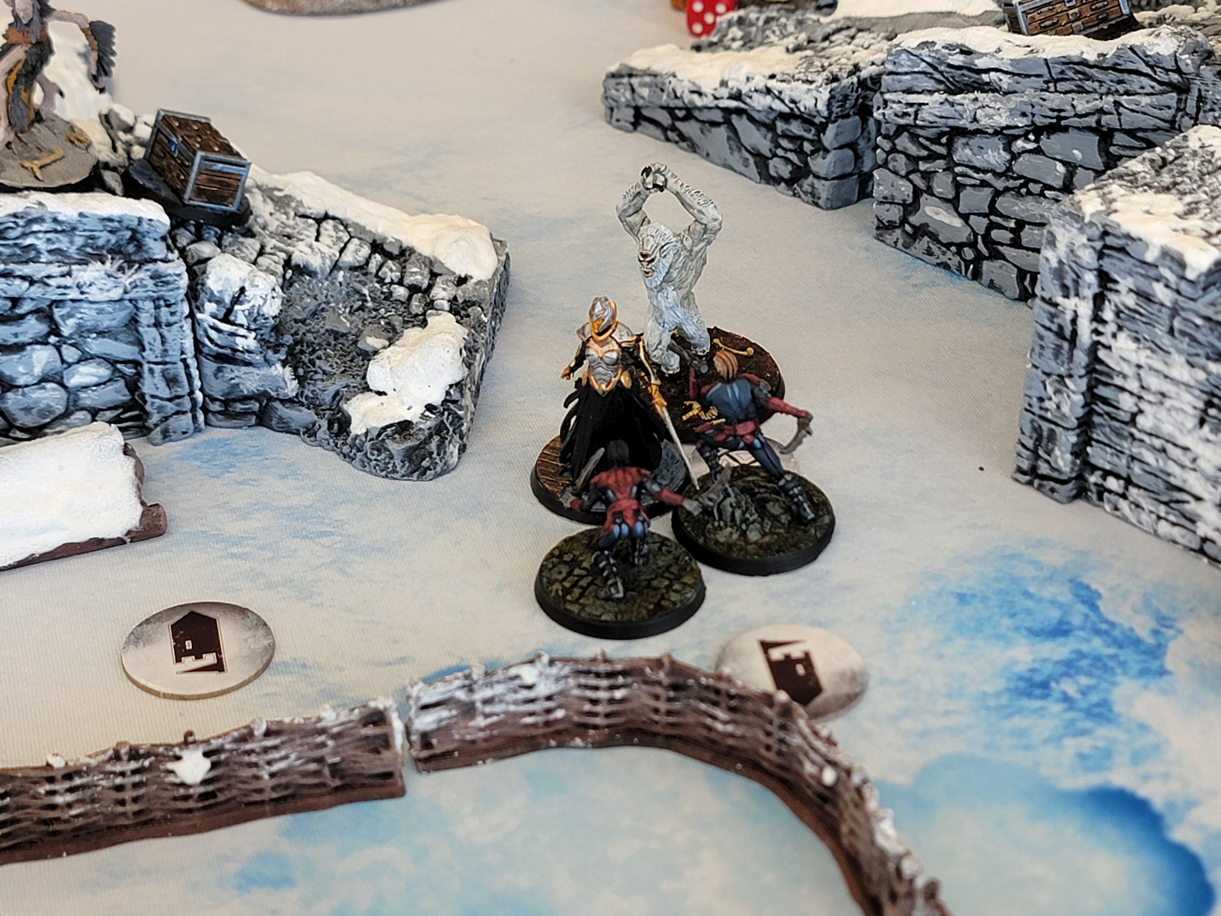I had two hero archers, a hero warrior-assassin, and a bunch of assassin mooks. My plan was to have my forces sneak forward (which makes them harder to attack) and apply pressure across the board, taking advantage of my greater numbers to access more of the hidden objectives and pick and choose which would bring me victory. My two archers were meant to solve problems where needed while my force closed in. They were also meant to capitalize on my faction ability to set assassination targets and gain extra VP for killing them–I chose two spiders that were in easy shooting range and one frost troll in the center that could go either direction.