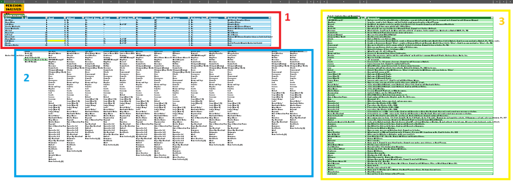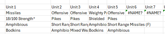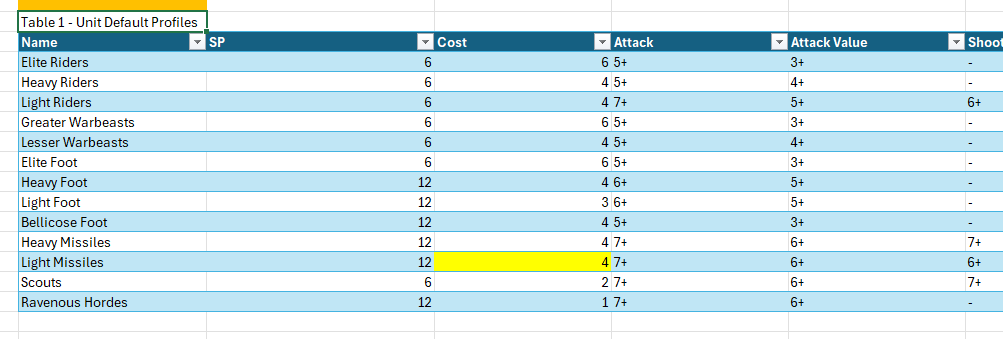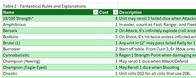 The final area goes over both fantastical and unit profile options (forgive the misnaming in the Excel–I’m lazy). This is simple: it lists the name, then the cost, then the description. The cost is used for calculations, so if you want to change the cost of Chaotic from 1 to -1, you just edit the line. Done. If you dislike my descriptions or want to tweak the skill’s text, do that in the “Description” column. Again, this is meant to be easy. This is a proper Table and is referenced as such in formulas. All you have to do is add a new line to the table at the bottom (which should integrate into the table automatically) and you’ll have created a new skill. Then you’ll want to add the skill to a unit in Area 2. Make sure your spelling matches!