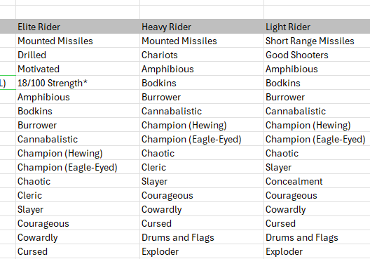 These lists feed the dropdown options for your unit skills on the Calculator. It will display in the exact order of this list. At the top are the unit’s profile skill options, then it goes into fantastical skills. This list reads down to Row 75 (more on that below). To add more skills, just add them below these lists in the same column. So, for instance, if I want my Light Riders to be capable of being Drilled, I just go to their list and add it onto the bottom. Done.