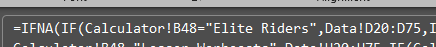 - It looks at the selected Unit Type on the calculator, then checks if it is one of the various unit types, which I typed in manually. It then references the appropriate column in Area 2 of the Data tab. Note how here it is looking at D20:D75. If you added enough skills to Elite Riders to go below row 75, you’d have to come here and edit it in the formula… across all 18 formulas. You can’t copy and paste it across cells. You’ll have to edit each individually. I’m sorry.