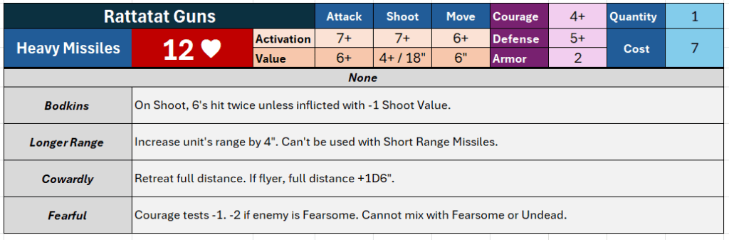 - The calculator only allows optional skills per unit. If you’re going beyond this, I consider you a madman. I had to really try to build the four skills into the unit above–my actual Rattatat Guns only have one skill.
