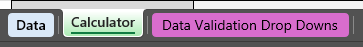 Note that there are three tabs–one of which is hidden (Data Validation Drop Downs) by default. Start with the Calculator tab.