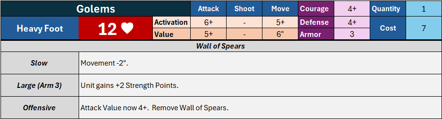 In either case, the point is that I get to build my army how I want. In fact, either of those units could be any number of models on whatever bases you want, so long as you can track the strength point loss over time. I’m envisioning them as two model units with each model having 7 health (for the total of 14 Strength Points with the ‘Large’ upgrade). You might make it a full unit of 14 golems! You own the freedom to choose here.