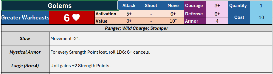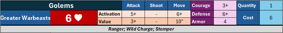In practice, looking at the warbeasts above, you can see they want to attack (5+) more than they want to move (6+). Attacking is the command to charge into combat and fight. Movement is just tactical movement around the battlefield. So clearly, these “golems” want to get stuck in more than they want to wander around.
