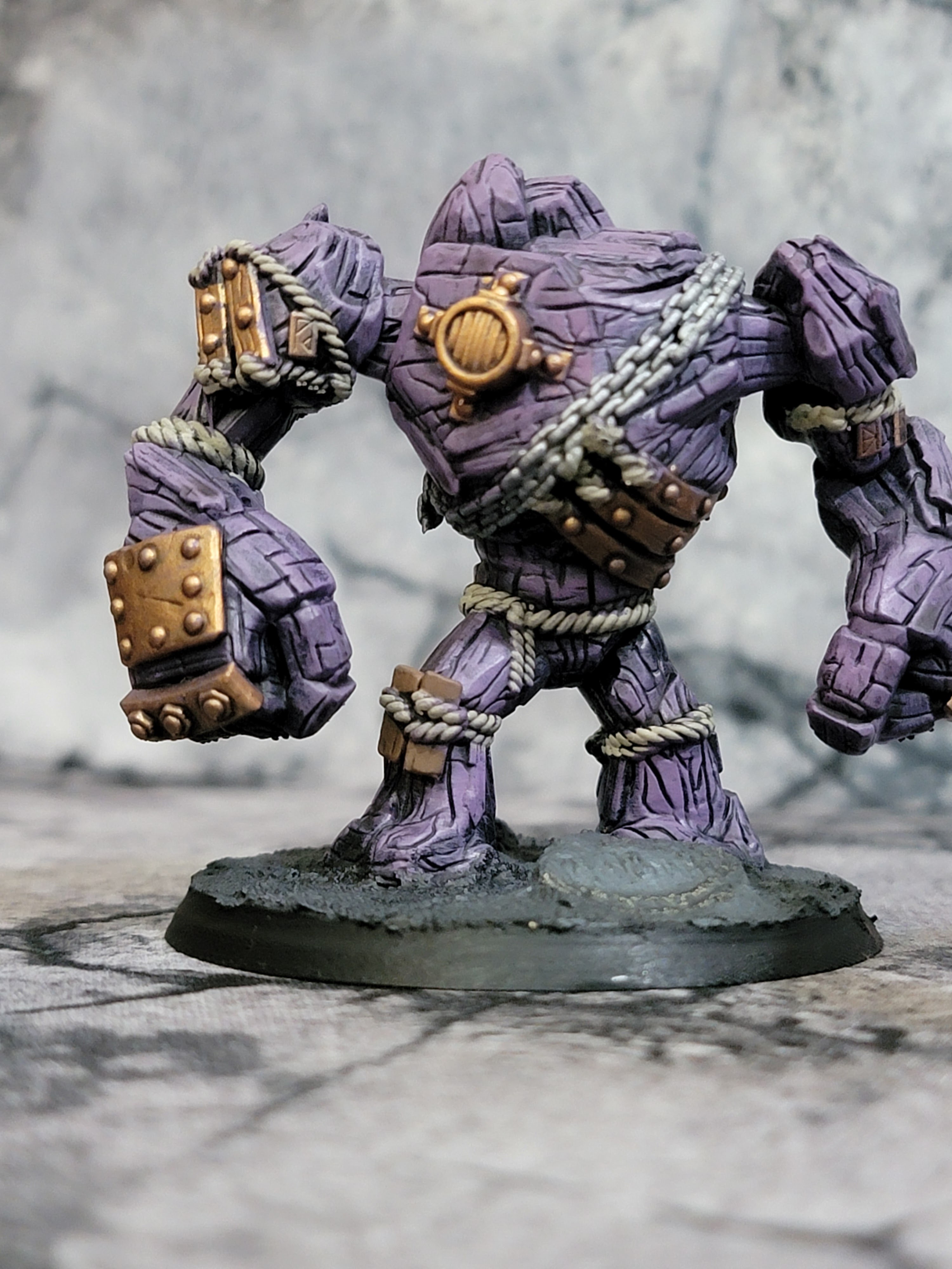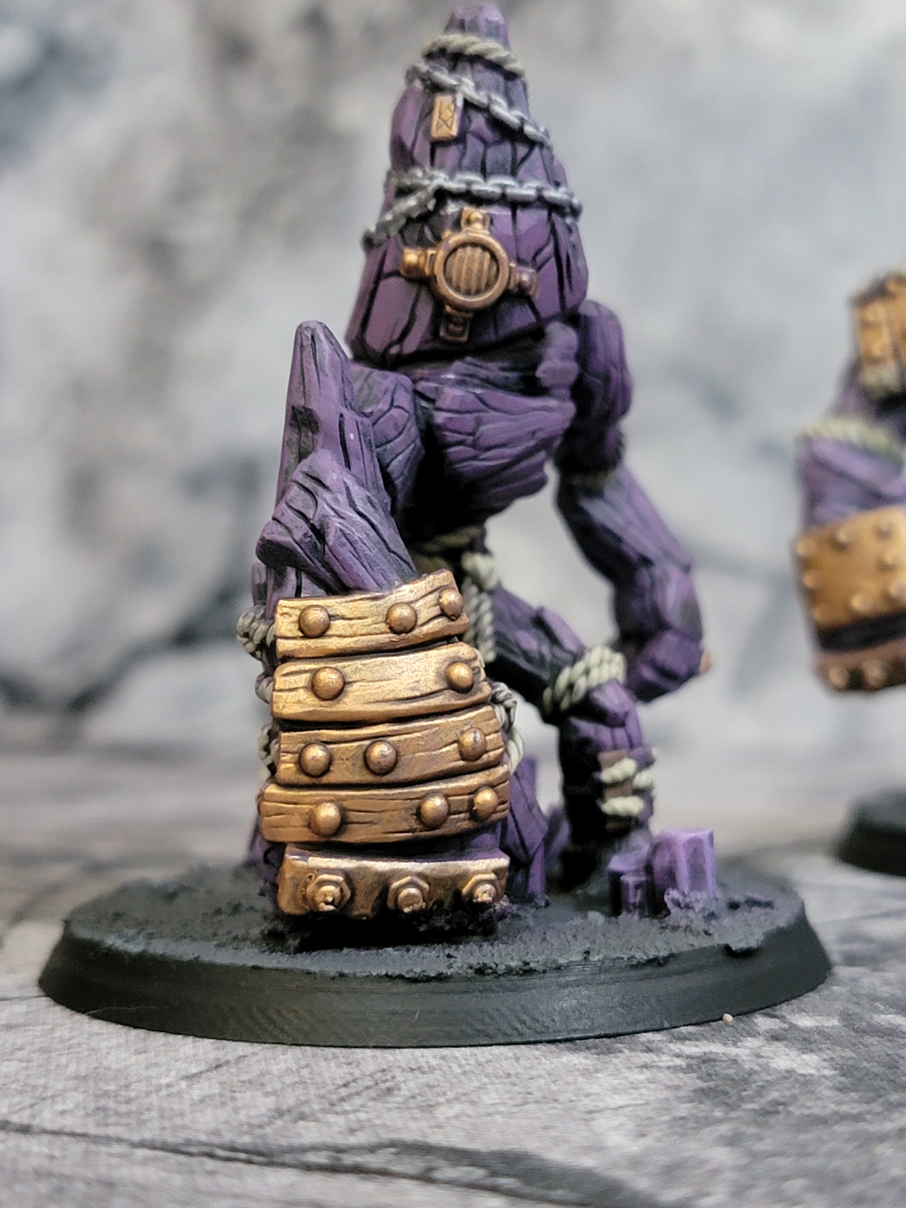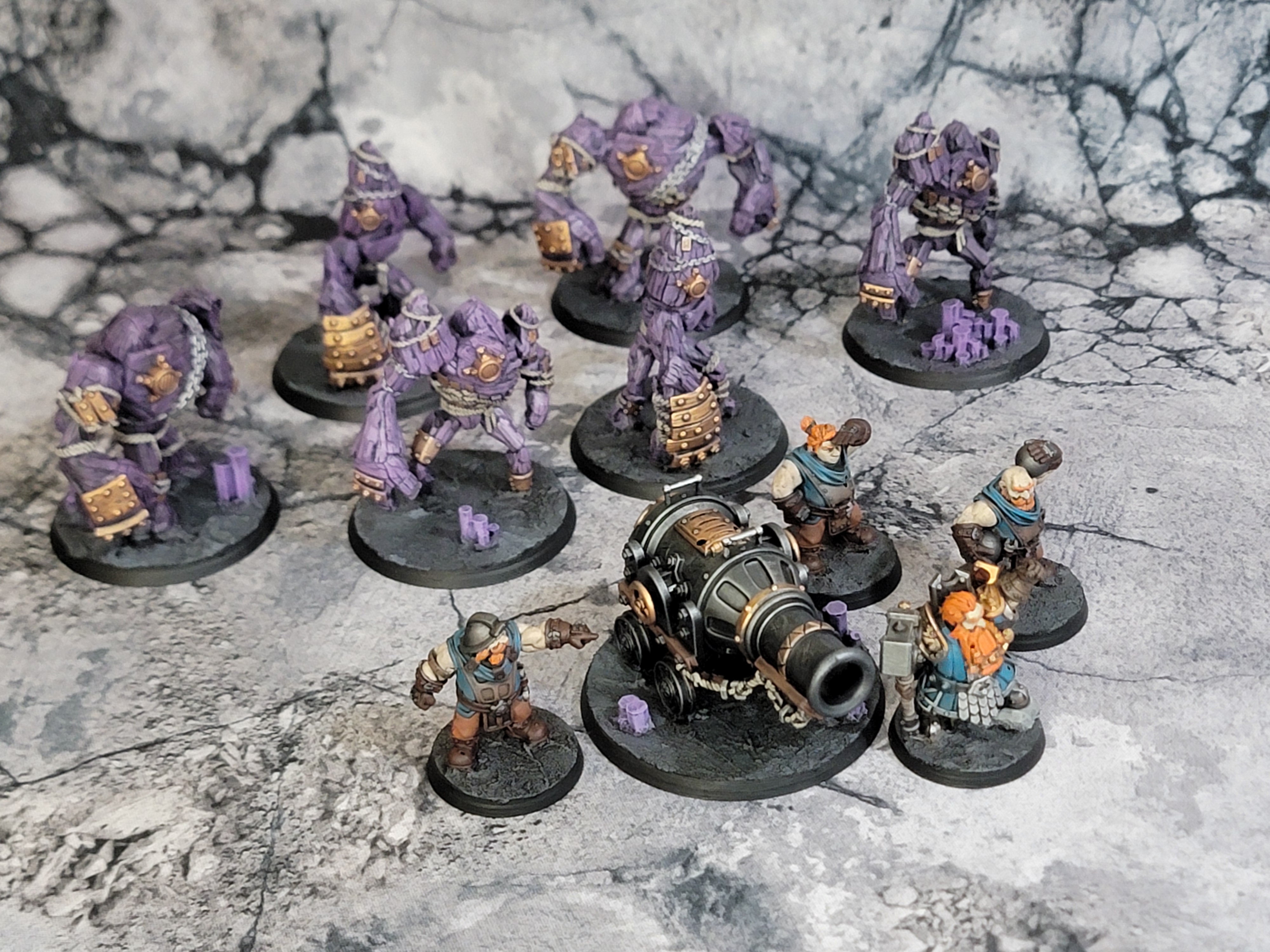 Next up, I painted the coal golems. Six of them, making up what I’ll call two units with each model having four strength points. I had a lot of fun with these and I’m really happy with how they came out. They took a dry brush super well and with all the ropes and chains and such they have just the right amount of detail. These are excellent. My only complaint is I wish there were more sculpts. I chose to make them purple to pop off the more teal-blue of the dwarves themselves.