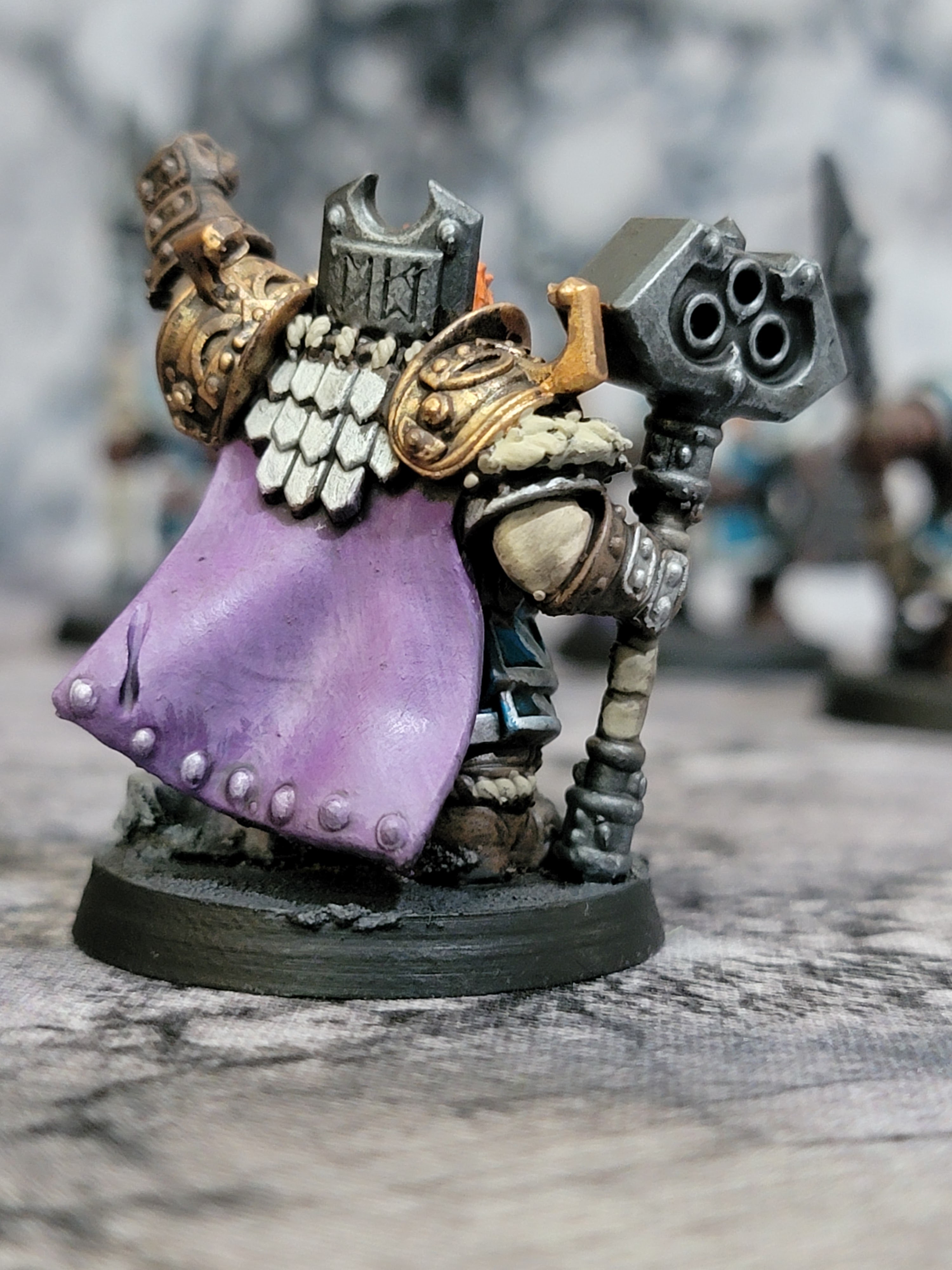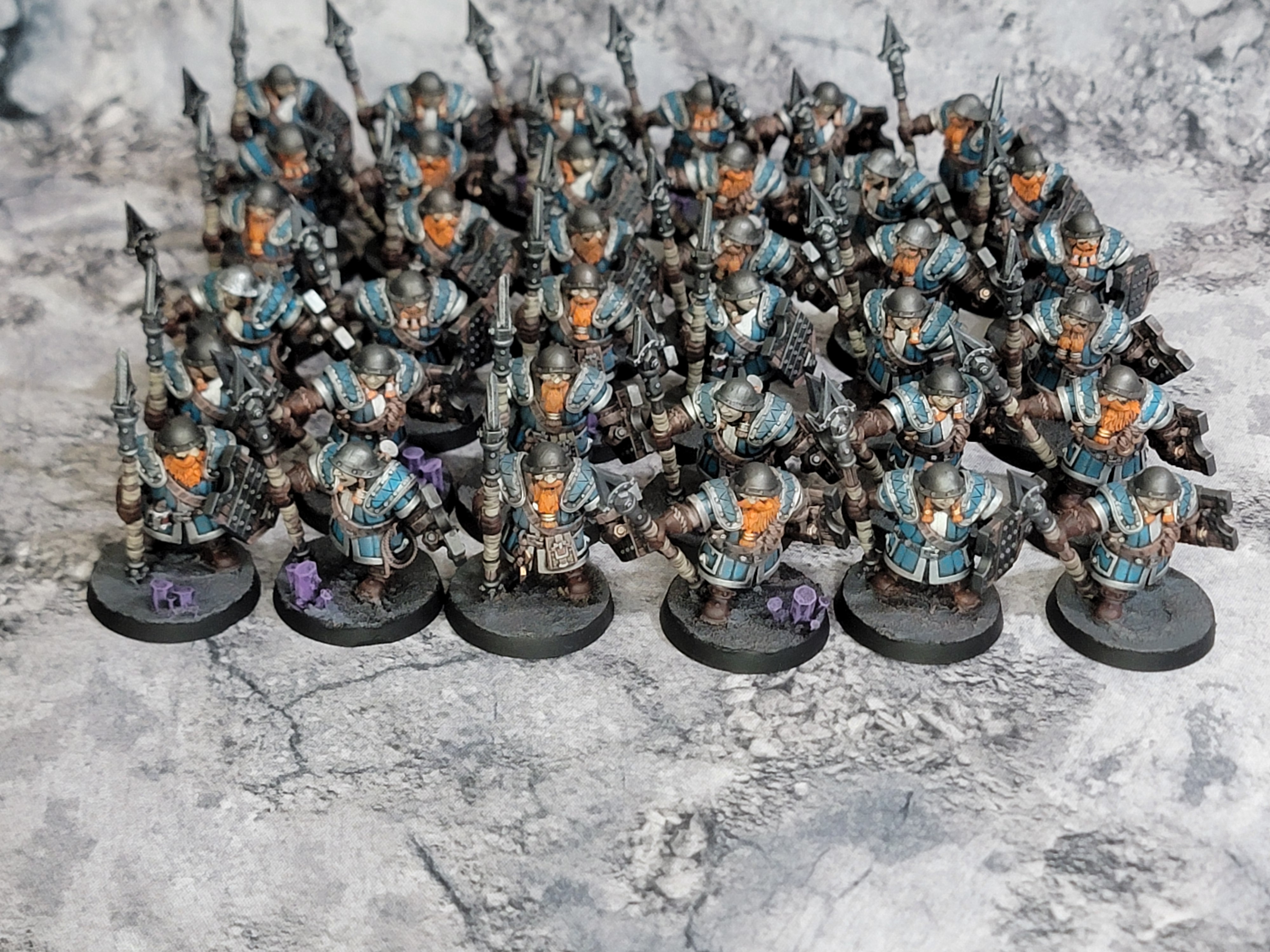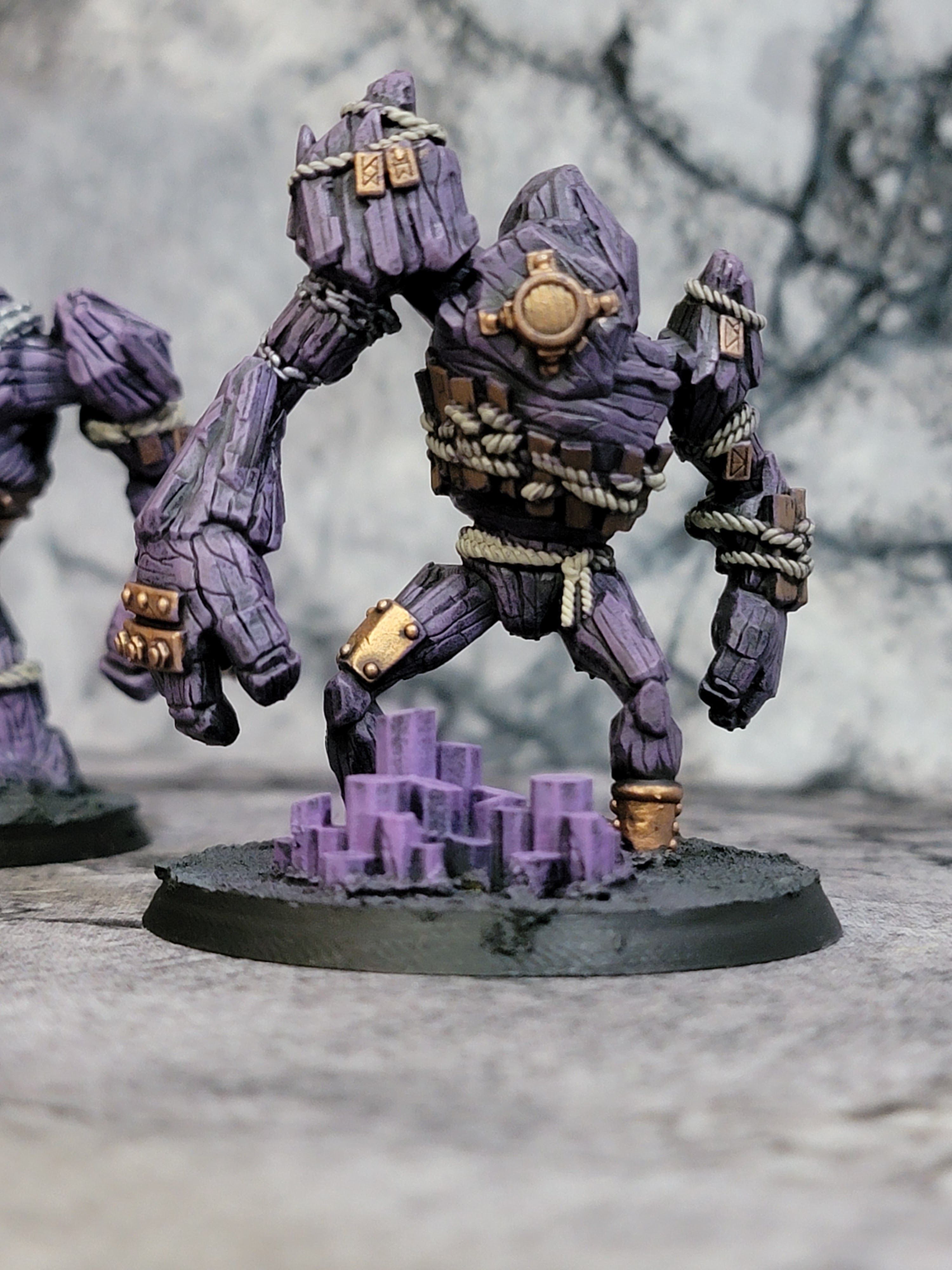 Next up, I painted the coal golems. Six of them, making up what I’ll call two units with each model having four strength points. I had a lot of fun with these and I’m really happy with how they came out. They took a dry brush super well and with all the ropes and chains and such they have just the right amount of detail. These are excellent. My only complaint is I wish there were more sculpts. I chose to make them purple to pop off the more teal-blue of the dwarves themselves.
