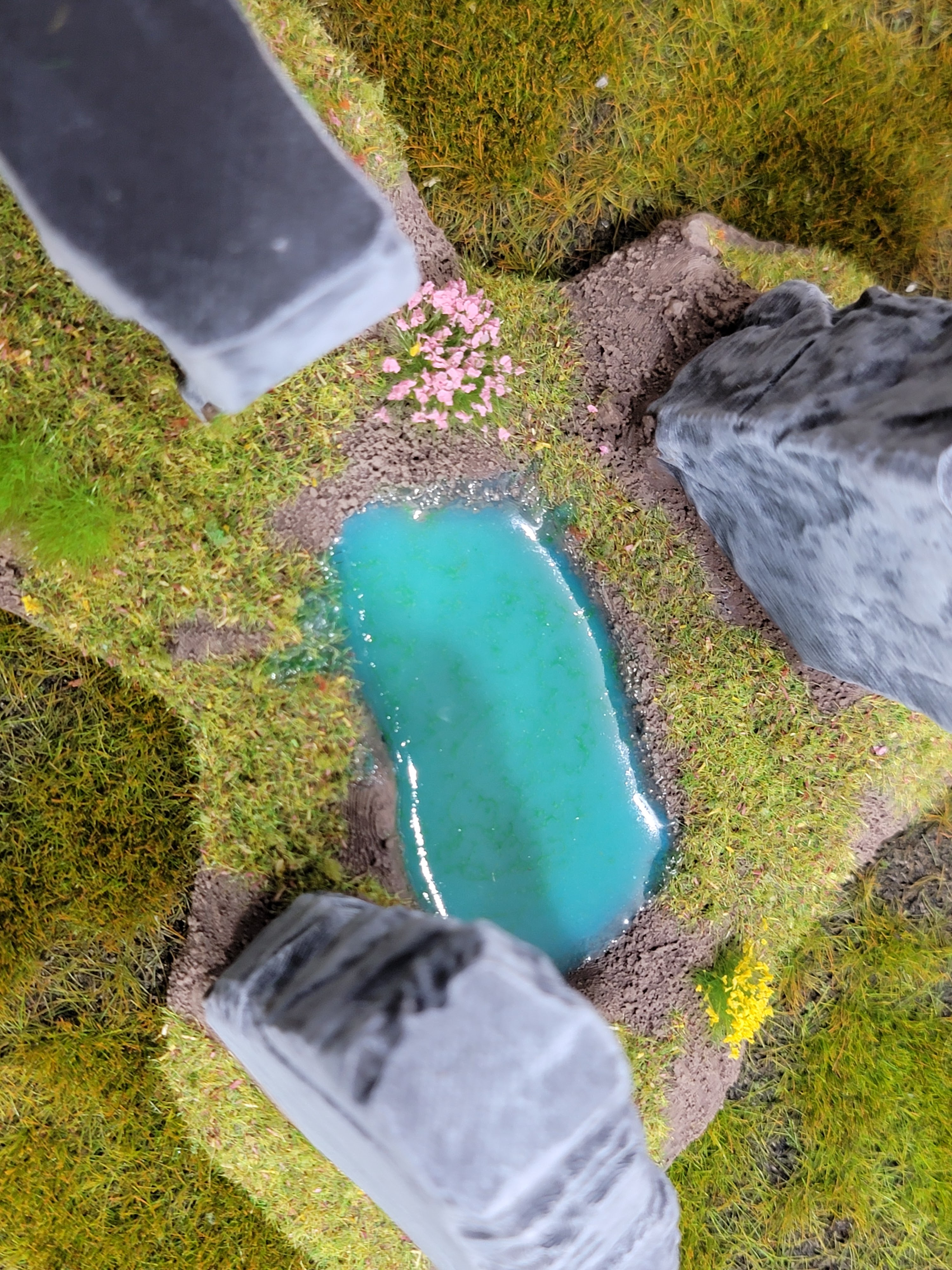 These were super easy to tear through. I dry brushed from black, then based them. The only wrinkle was a small pool of water, which I choose to make teal, with bits of green floating in it.