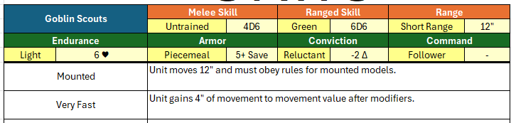 So goblins are goblins, which is to say they are really just small scared humans. Does that really make a difference? Would goblin light infantry be employed differently from human light infantry? If yes, how? The game should enable the expression of that difference. Let’s look at goblins riding wolves. They move about faster than mounted humans but they’re more cowardly and will disengage from battle if pressed. Okay, cool–so the game needs a way of modeling that lack of commitment.