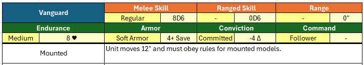 We’ve accounted for how long a unit will stay in a melee–that’s what Conviction will do. A “reluctant” unit will flee a melee when it rolls two less successes than the opposing unit. Combine that with a low combat value (4D6) and this unit is likely to flee from most melees. I clearly built them to run in, capture an advanced objective, and maybe harass some enemies from a range. Contrast them against my human vanguard: