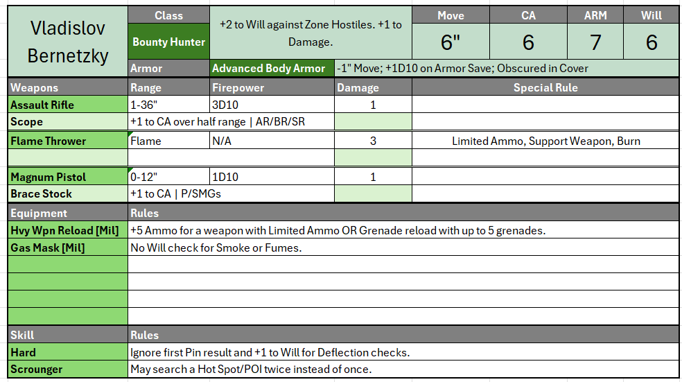 I have, like always, built a simple Excel that allows you to build your characters via drop downs and the like. I plan on my son and I building four characters each, then selecting two each per mission. If they die permanently on the injury table, they’re out for the rest of the campaign. I’m unsure if my son will really take to building them, given it’s just dudes with guns, but I’m going to encourage him to think about it and review his options.