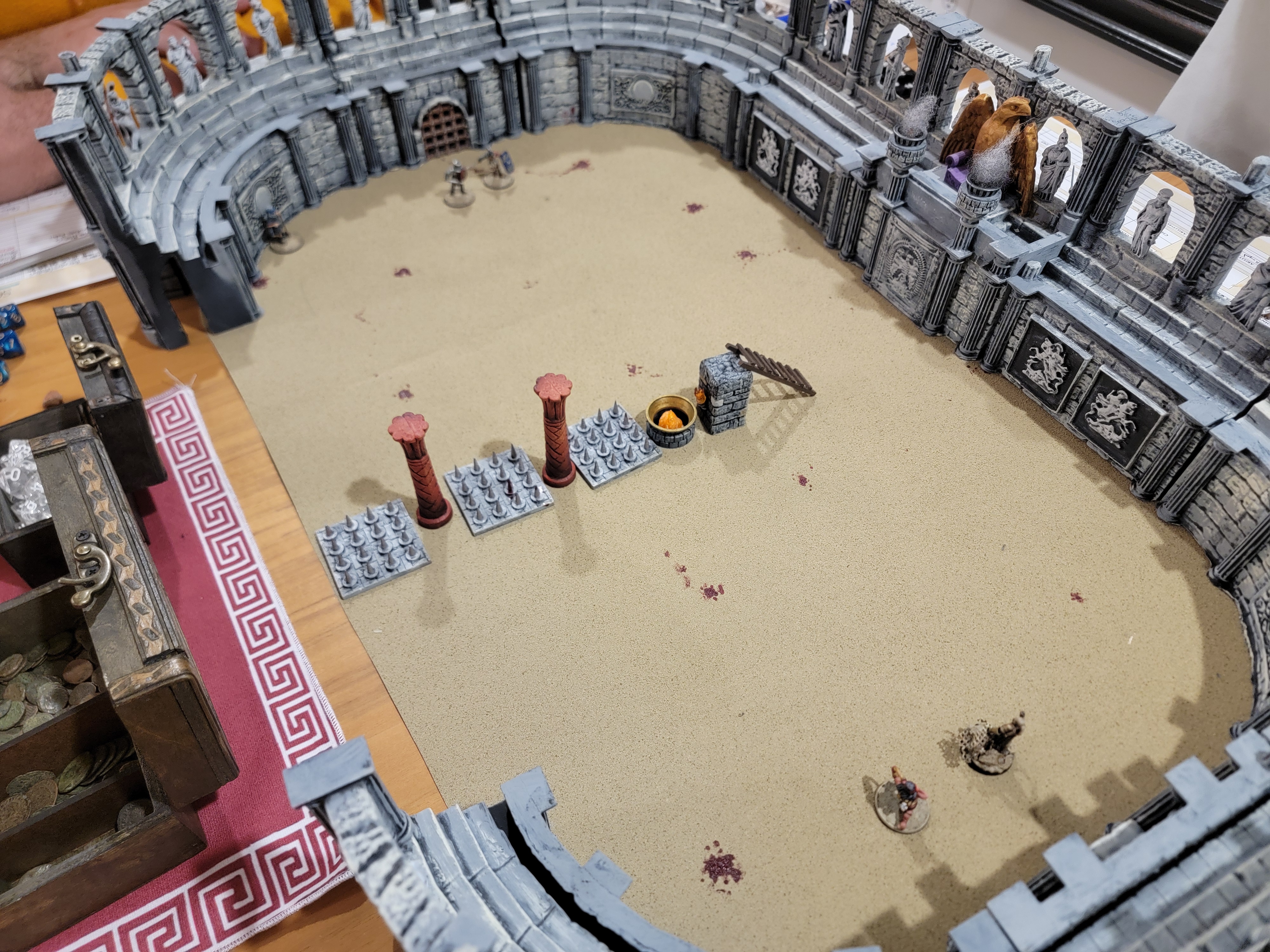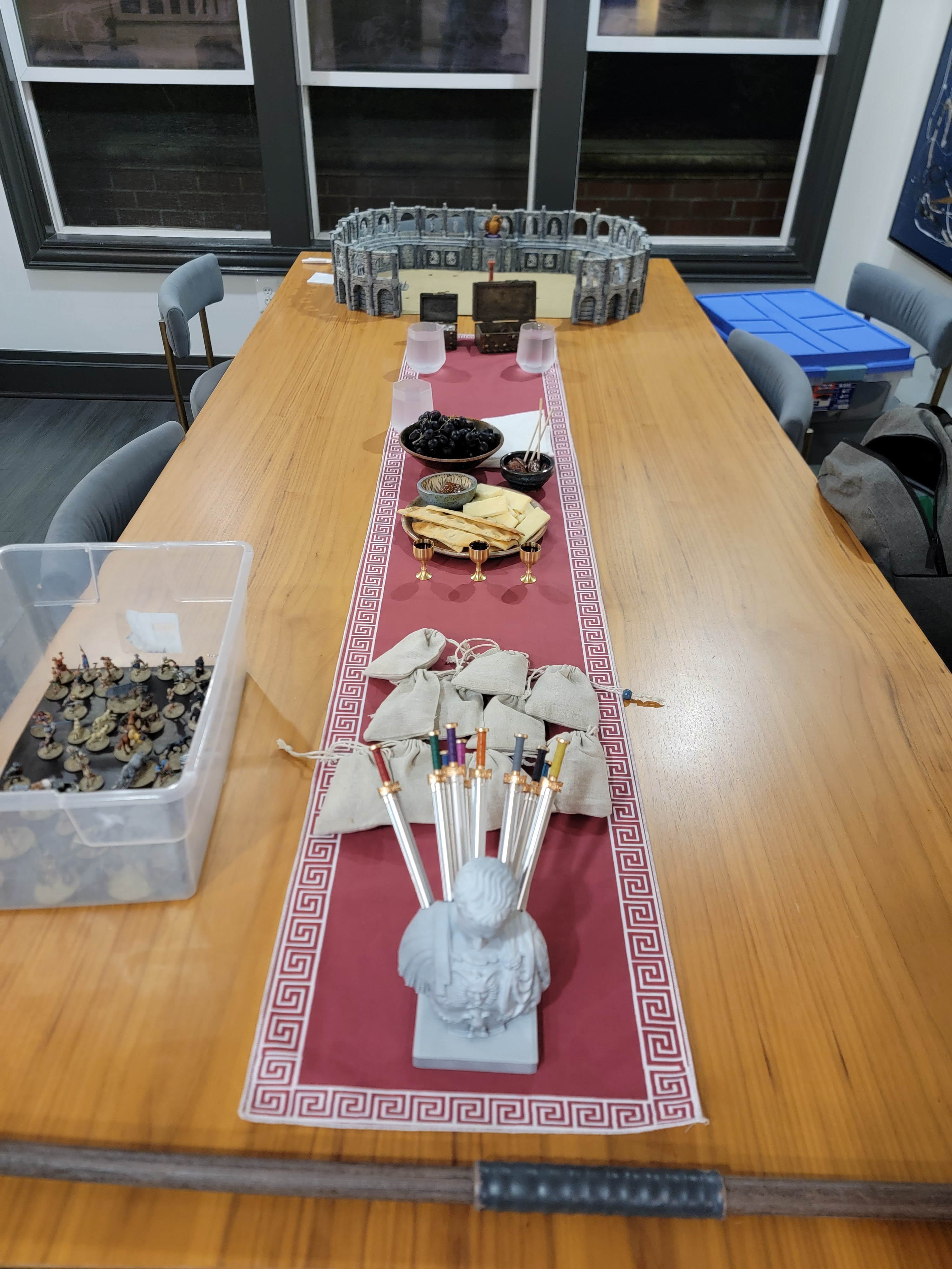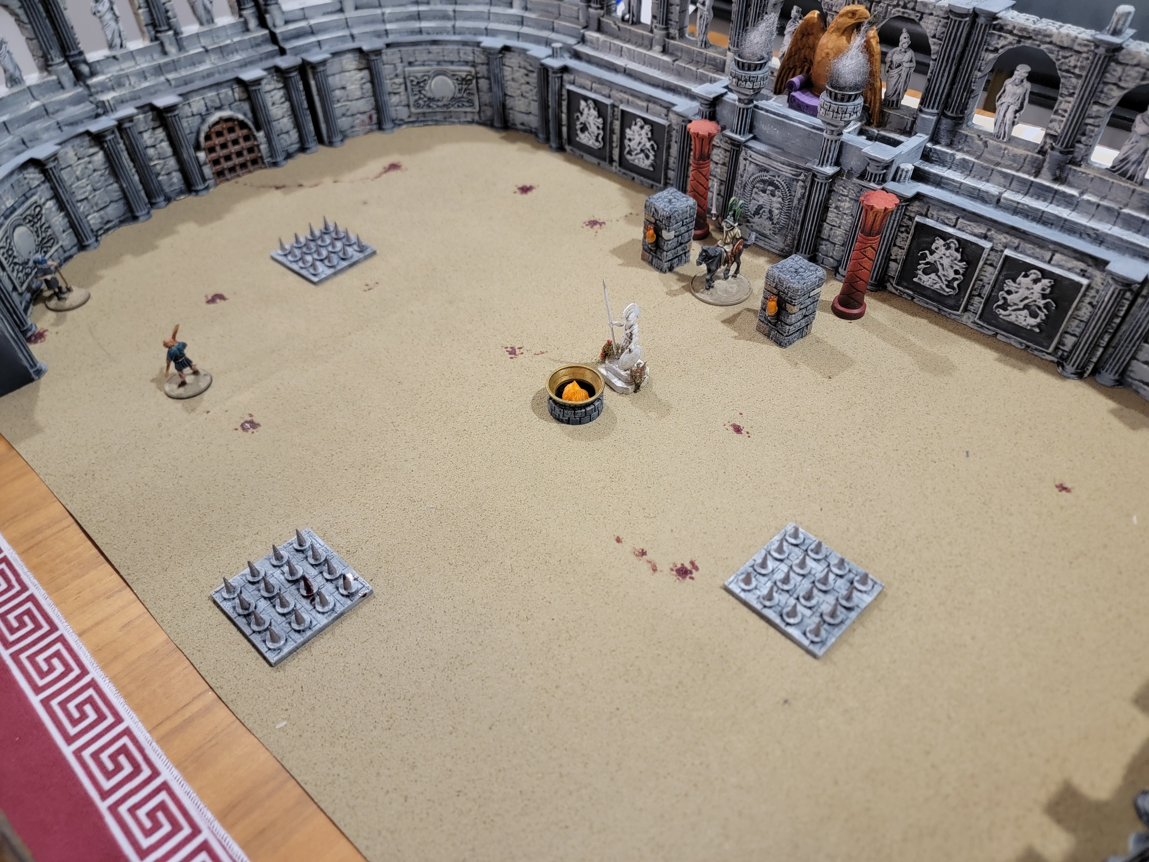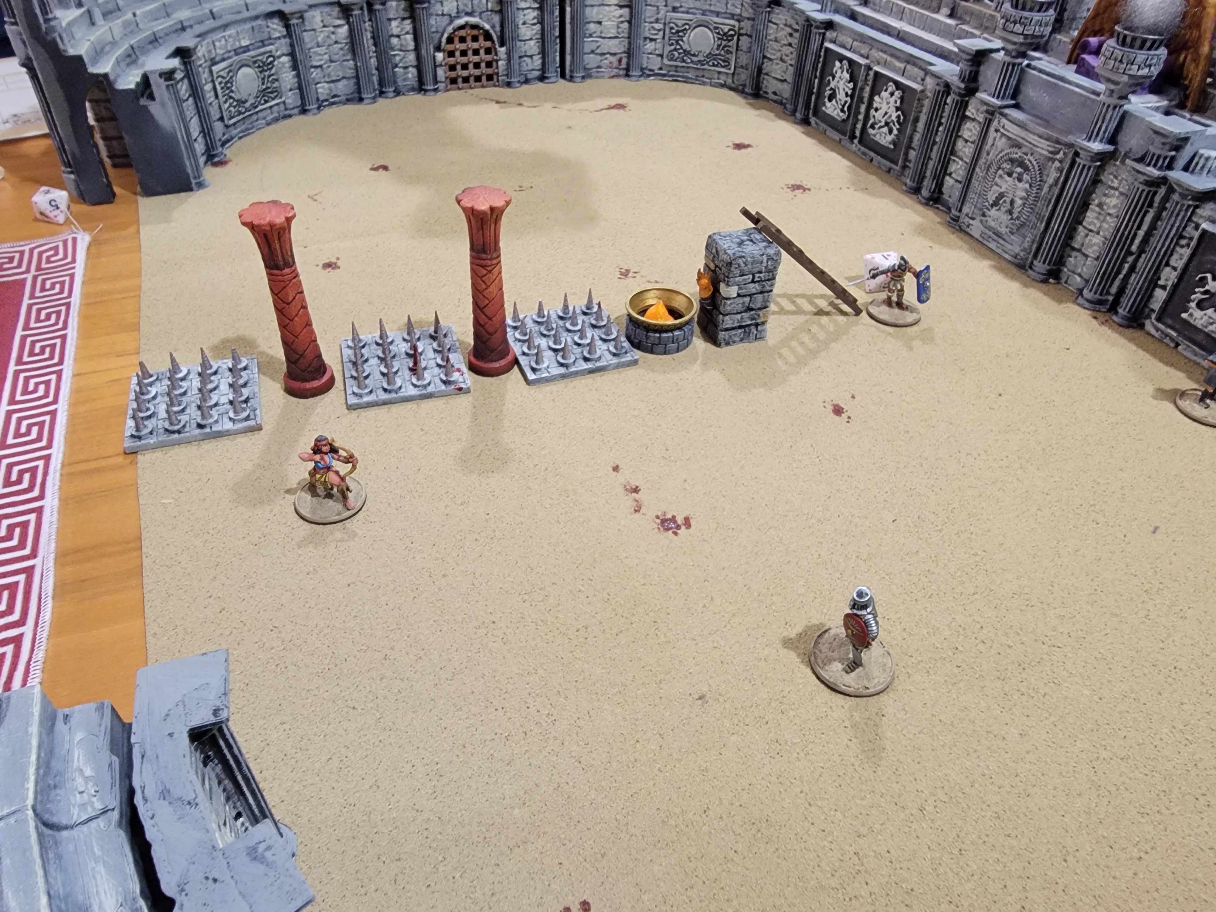 For this match, our host graciously asked my son (who tagged along to watch) to setup our next arena. He had some fun setting up what I think is an obstacle course and the other players were kind enough to play it out. On our side, we had an archer and a velites, so two ranged characters. Our opposing side was a pair of traditional melee oriented gladiators, one of whom we refer to as bucket head.