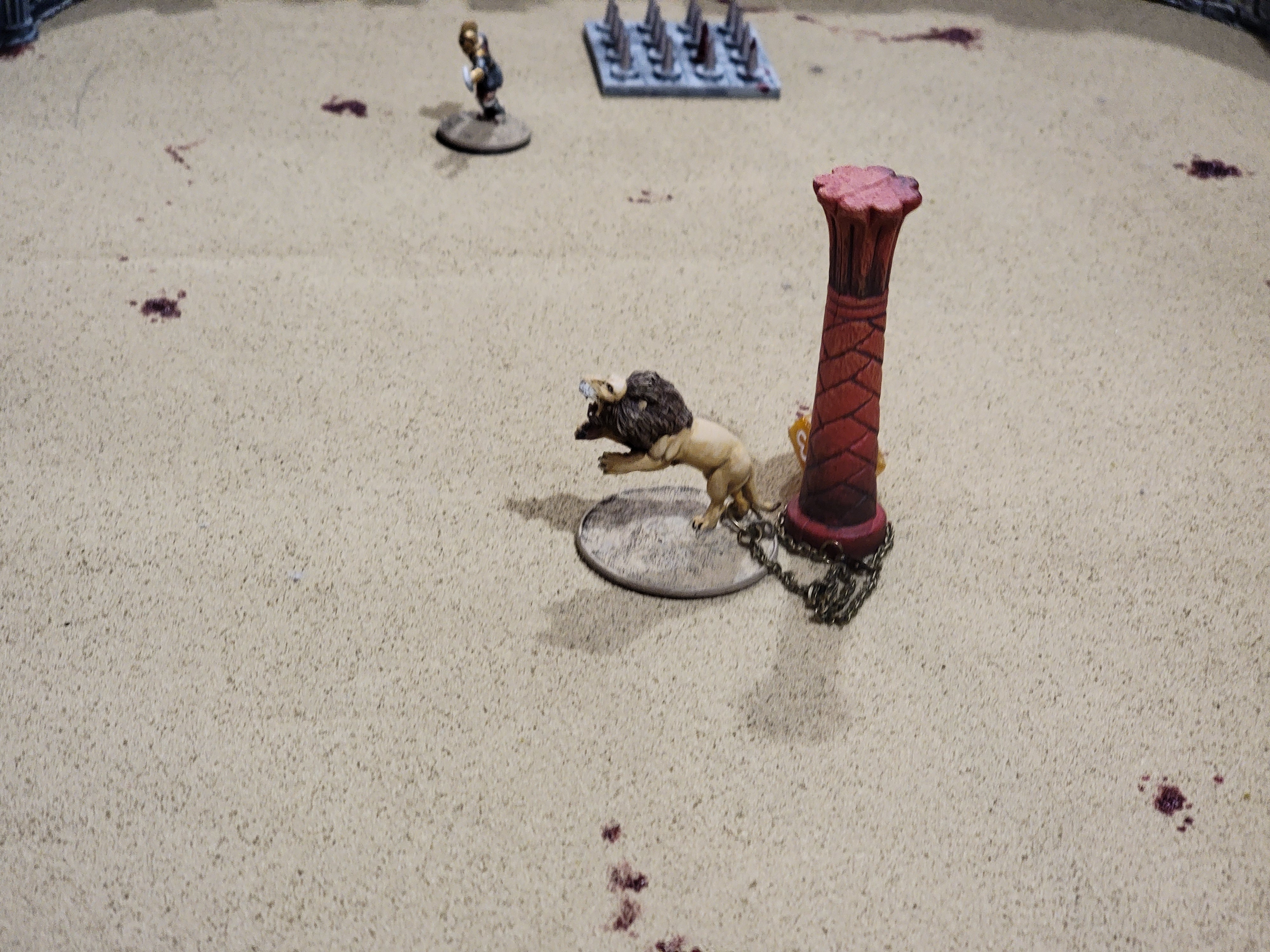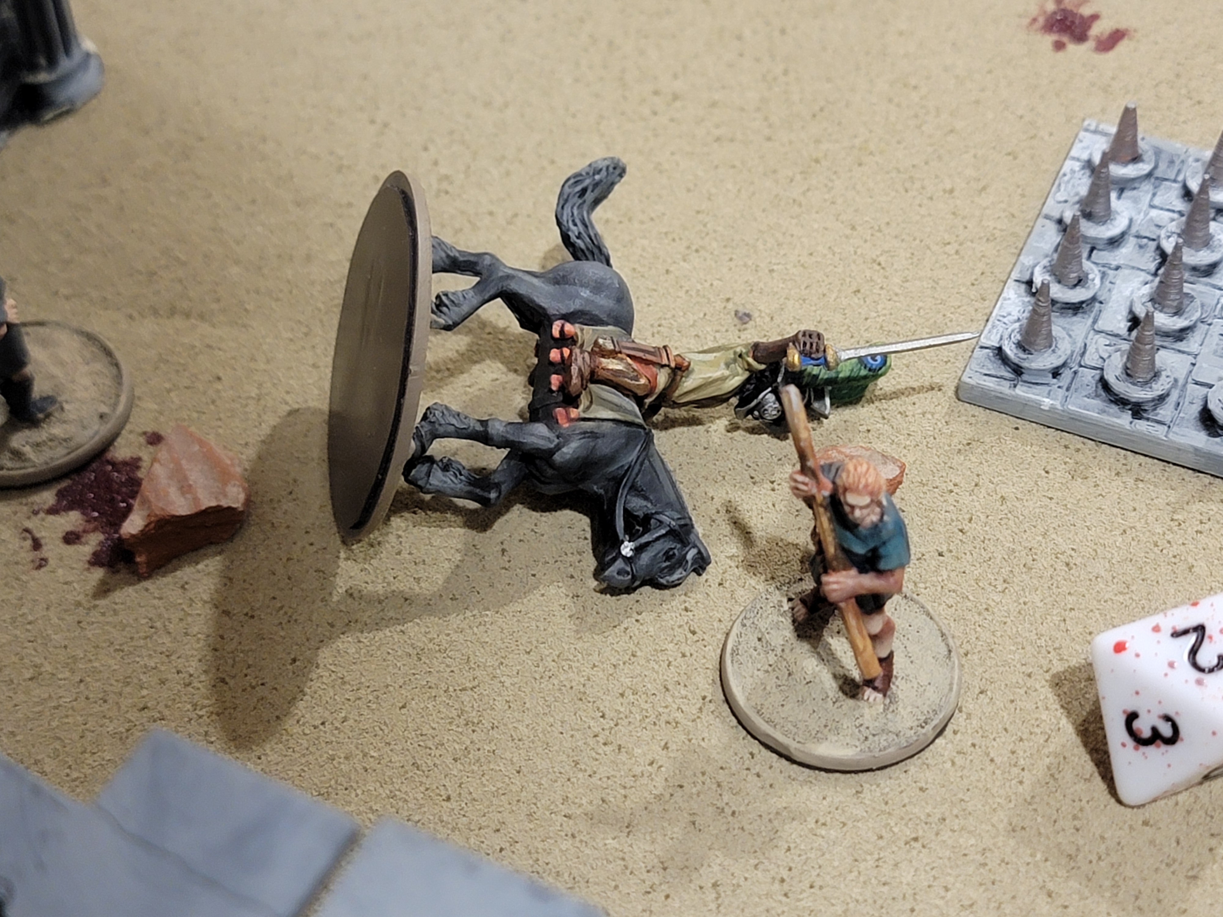 This was a 2v1 between two gladiators on foot and a mounted gladiator on a much better setup field (also my son, if I remember correctly). After digesting the mounted rules, we were off to the races and I… uh… died. I died again.