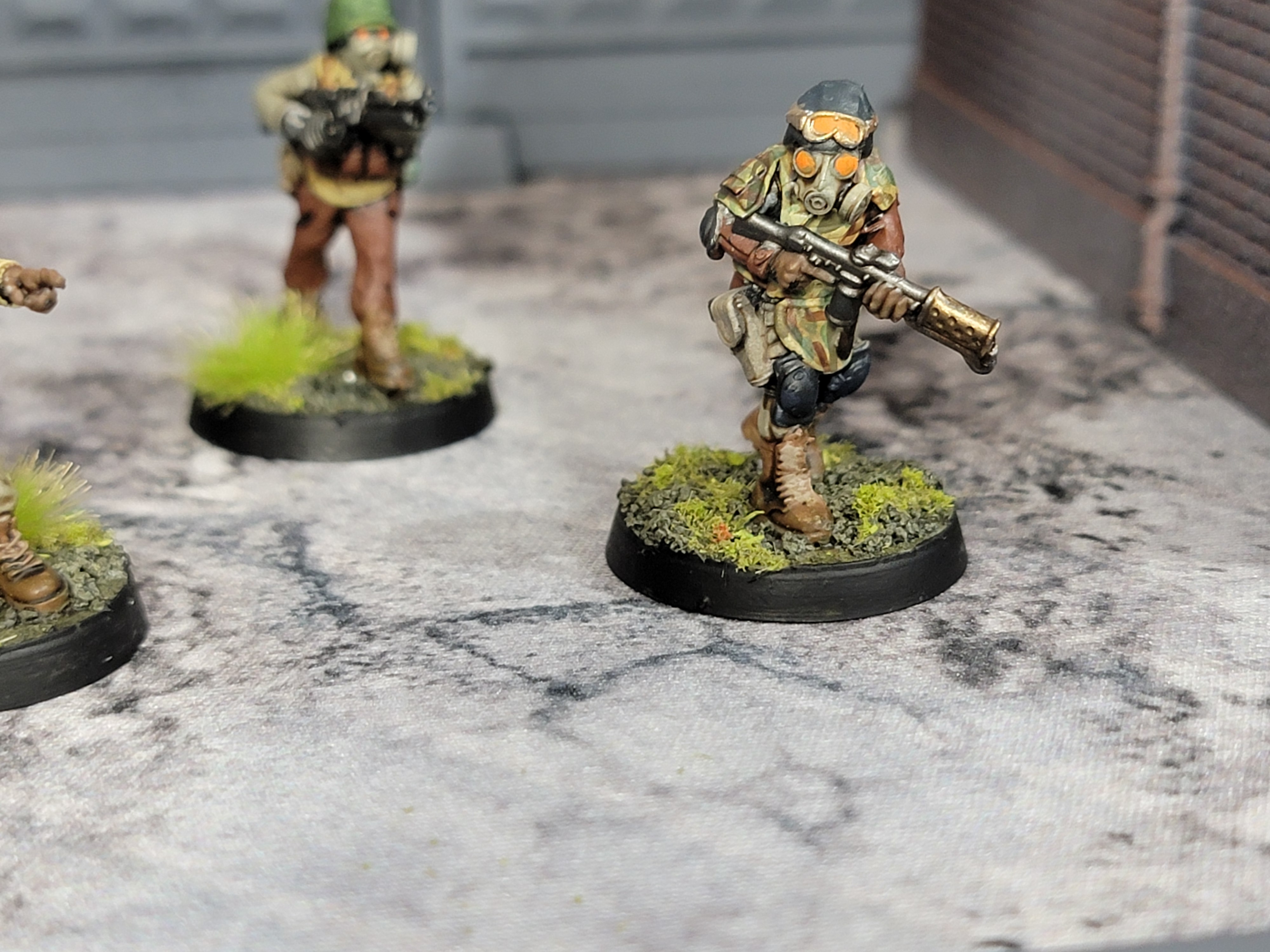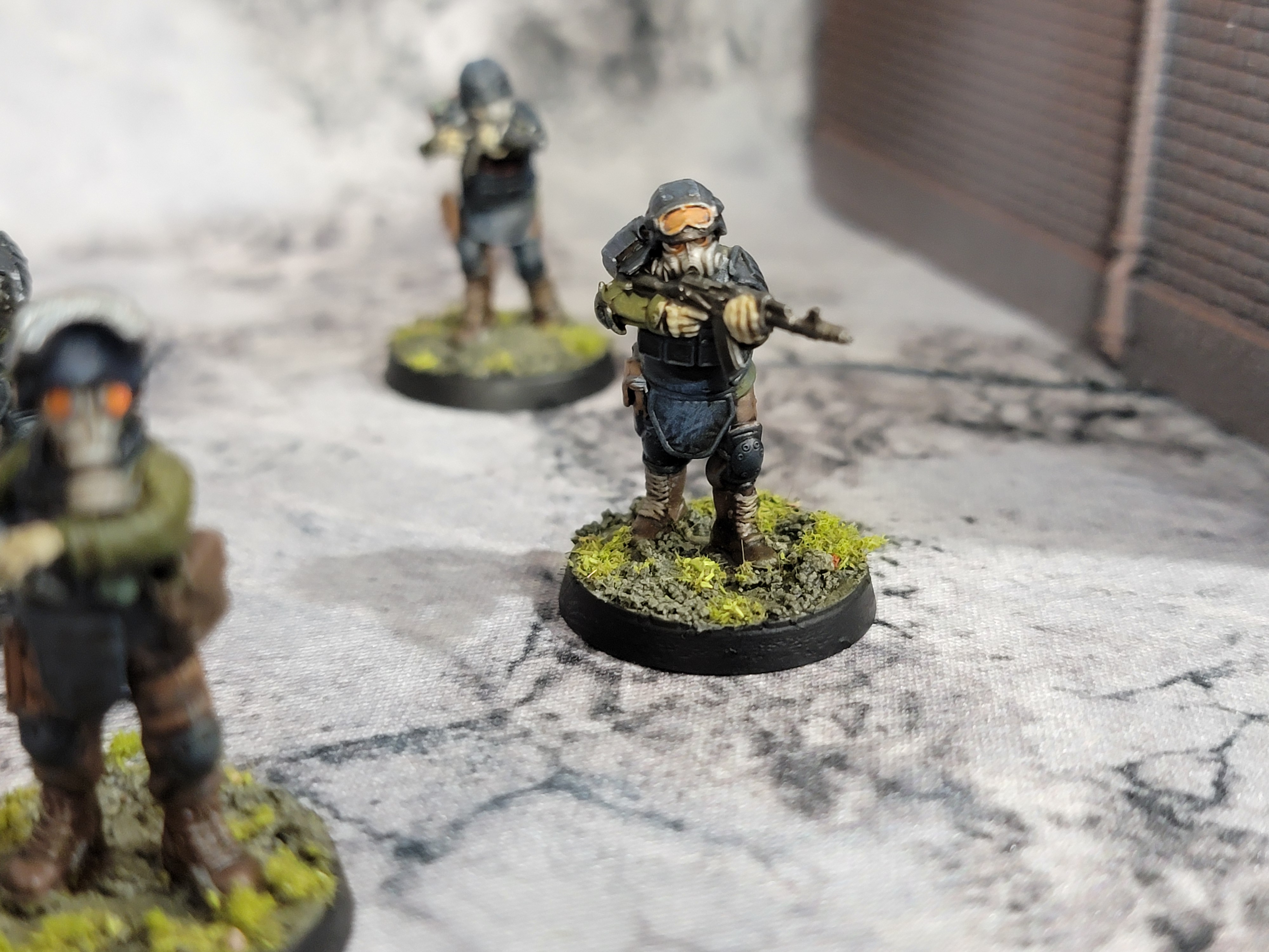 This next batch here is intended to be bandit-coded. Again, they could also be stalkers–there’s honestly little difference. Stalkers tend to be former or active criminals, even setting aside that breaking into the zone is a crime in itself. I just finished a reread of Roadside Picnic and I’m sure any of these men would have fit right in. These are still pretty consistent with each other: I used the same color pallet but varied application across models. A little touch of red or blue here and there and they came out feeling reasonably distinct while painting up quickly.