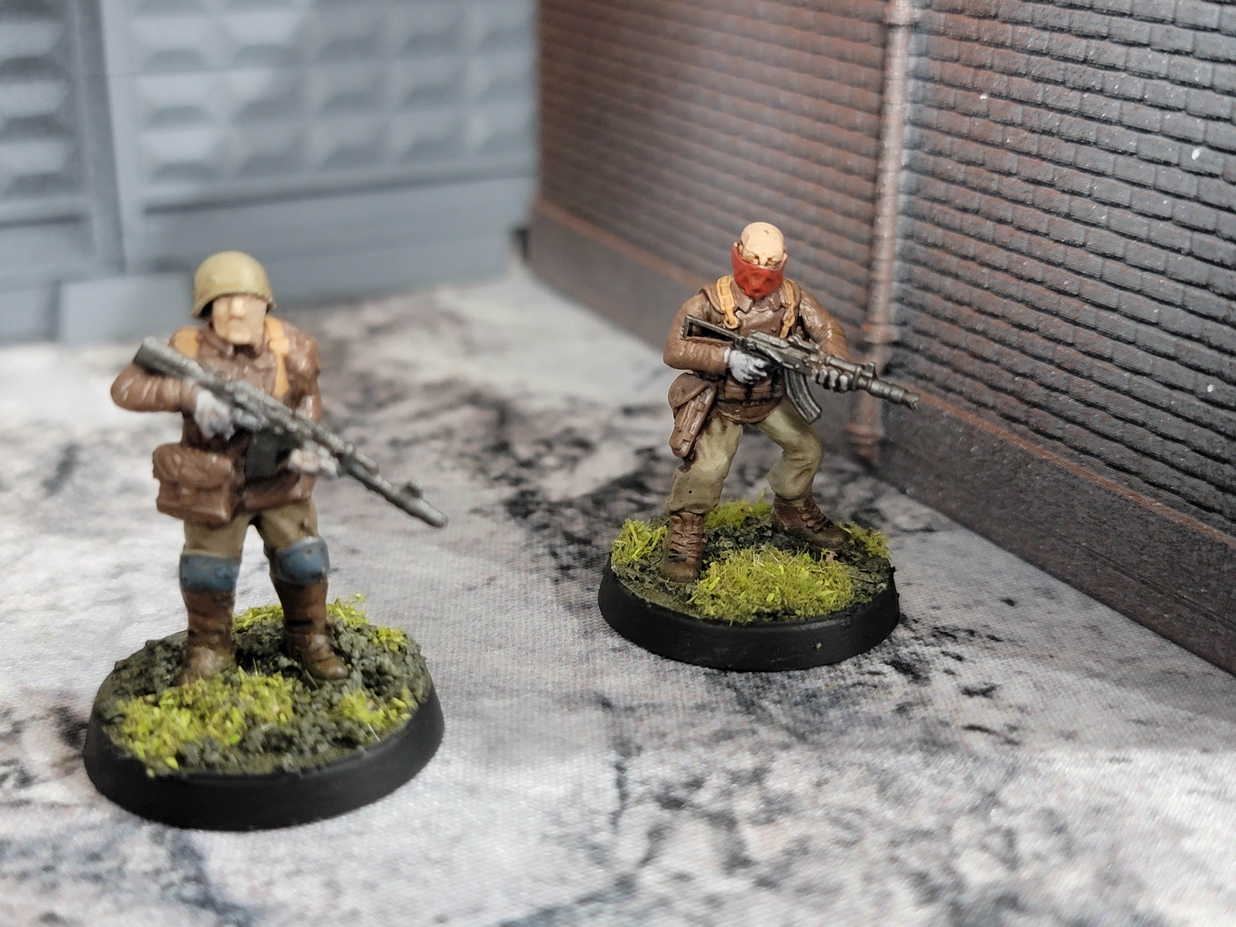 The models are all interchangeable, really, but this first group was specifically meant to be a batch of security guards or military. I made their uniforms more consistent than the rest of the models, but as onesies twosies they could readily augment a bandit or stalker force.