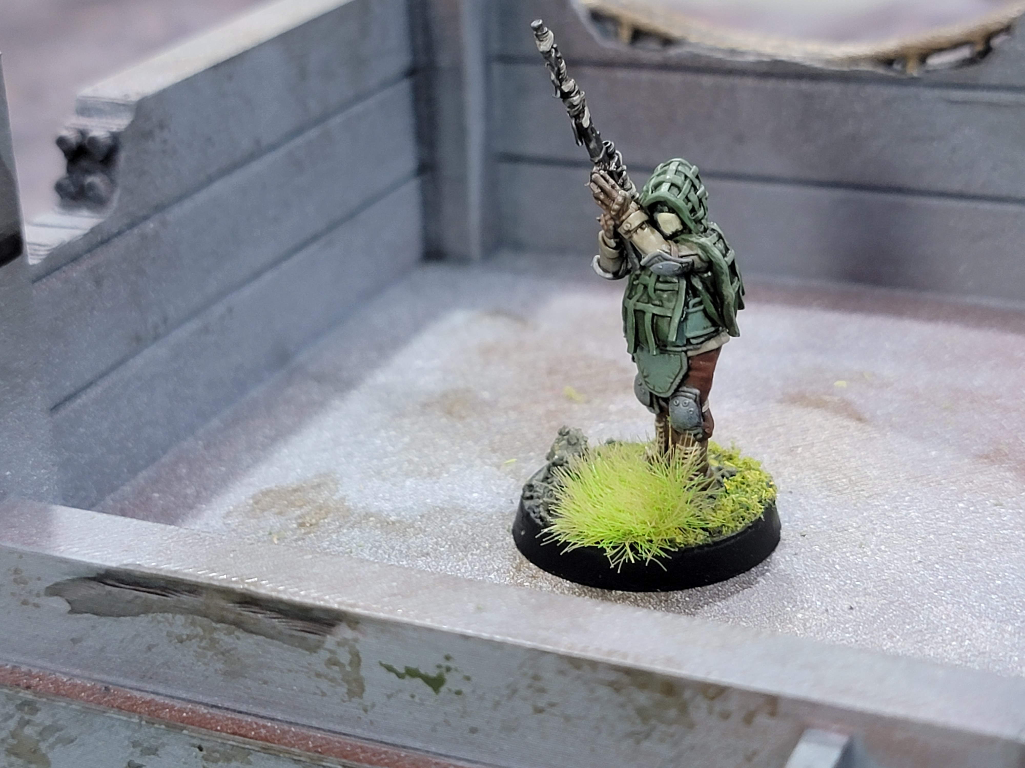 The Assault Rifle has a Scope, which gives me +1 Combat Ability (to-hit) at over half range. Neat! That could have… been a better gun, I guess. It’s fine. It’s certainly not complicated and it adds to the storytelling. You can imagine being a stalker and wanting to customize your precious weaponry. That gun is your lifeline–attaching a scope to it feels very in-character. My bigger issue is the lack of options for attachments. Often times you’ll look at the list for your guns and just go “I guess I’ll grab the obvious three.” For example: a battle rifle has three possible upgrades: under-barrel grenade launcher, scope, and bayonet. Well, you have a melee weapon as well, so the bayonet isn’t particularly useful. There’s no trade off for the other two, so you take them. Let’s say your melee weapon is an SMG, giving you the options of a brace stock (+1 combat ability), a red dot (+1 CA under half distance [9″]), or a suppressor (a wonky rule). Well, you’ve got one slot left so you’ll pick the obviously best option: brace stock.