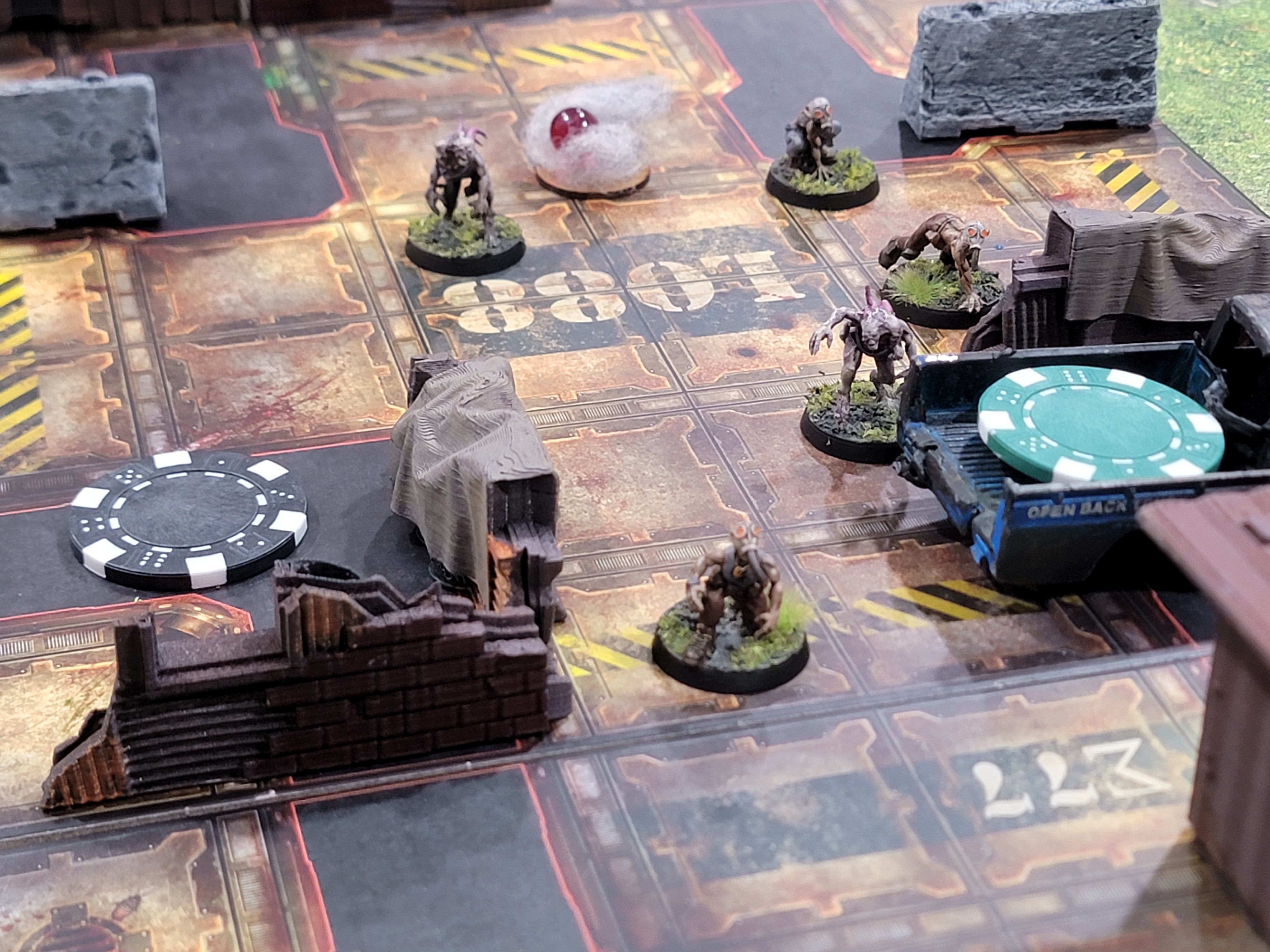 The Zone itself may as well be a character. Each battle will have a threat level. The higher your threat level, the more dangerous everything is (surprise!). At higher threats, the monsters do get more dangerous and so does the environment. Monsters are simple: they get stronger but follow the same basic “attack nearest thing while staying near your objective” AI. The environment is composed of a series of points of interest (POIs) on the board. Each one has a chance to produce salvage, anomalies, and/or enemies depending on how you roll. It’s a system that keeps you uncertain of what is going to happen in each battle and makes exploring rather fun.