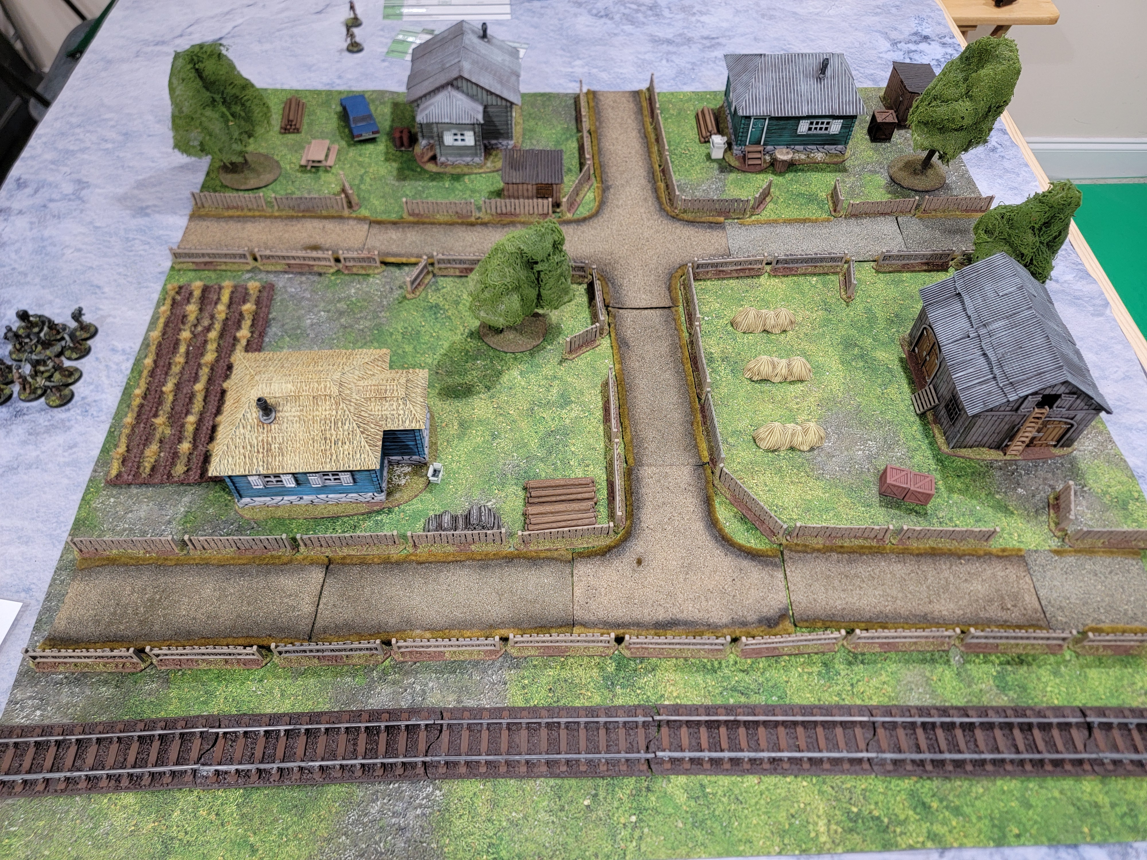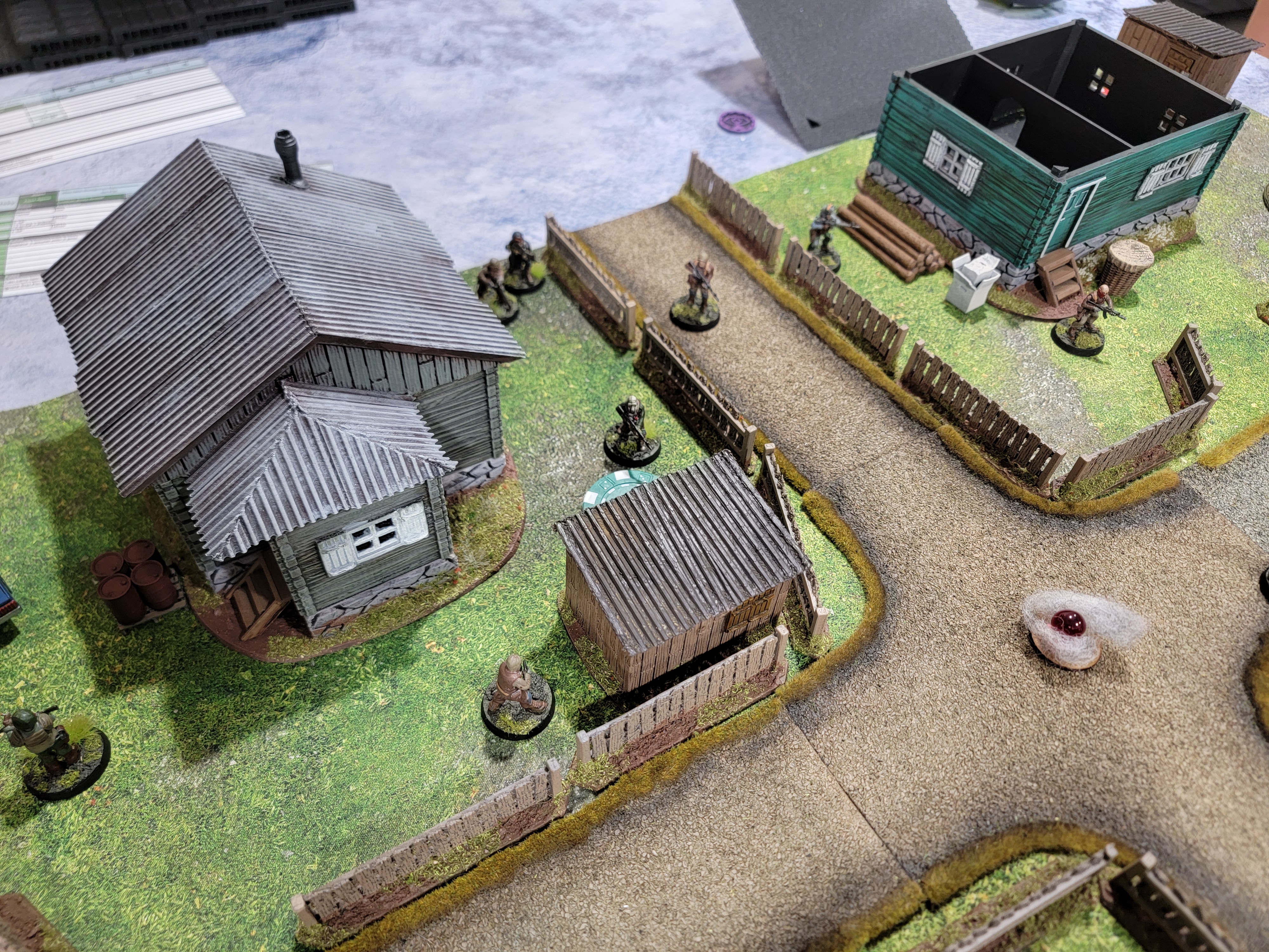 This scenario revolved around an abandoned, intact village. Reports have it that it’s full of undead and there’s the sound of static in the air, so piercing that it makes it hard to focus. For gameplay, there’s a single anomaly that is causing the sound, giving players -2 to ranged attacks. It’s hard to focus long enough to line up the shot. So why are we here? Well, the lead scientist whose work we’re pursuing used to live here, so we’re going to search for his house, then ransack it for notes.