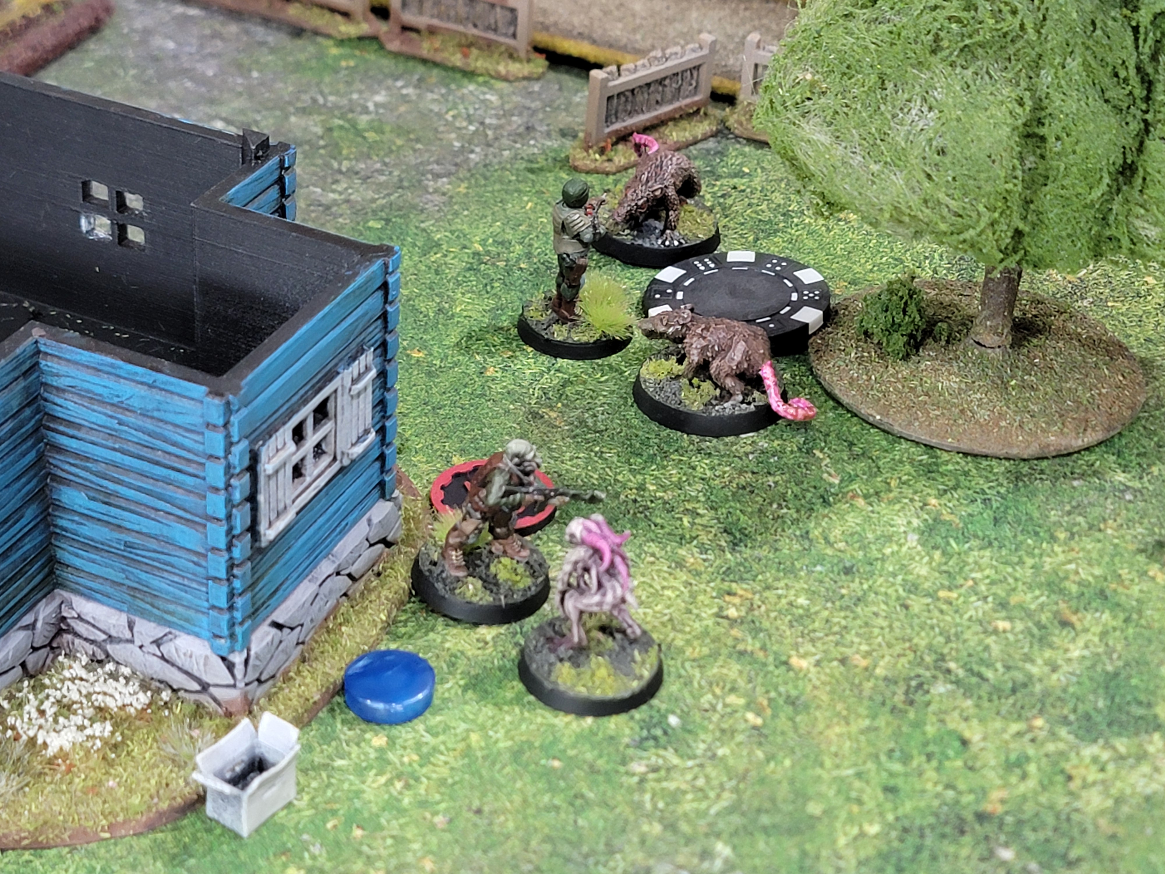 Each time you enter a house you roll 1D6. On 1-3, 1D6 zombies are inside the house. On 4-5, you draw a POI card. On 6, you found the right house and can discover the hidden notes. As I said earlier, I’ve built more triggers into my missions to enable monsters to spawn. With four houses, I assumed we would see two sets of zombies. I was very wrong.