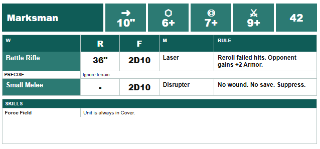 To explain the card itself just a touch: you set your move, armor, shooting, and melee skill in that order as it appears. You then select both a primary and secondary weapon weapons and their munition types, which modifies them. Here, you see the Battle Rifle has the Laser munition, which gives it the ability to reroll failed hits with the opponent gaining armor as a result. Its skill is “Precise” which allows it to ignore intervening terrain (that is entirely my fault on the data I fed it). You then also see he has a small melee weapon with the Disrupter munition, which instead of wounding suppresses. Great example of the customization I intend.