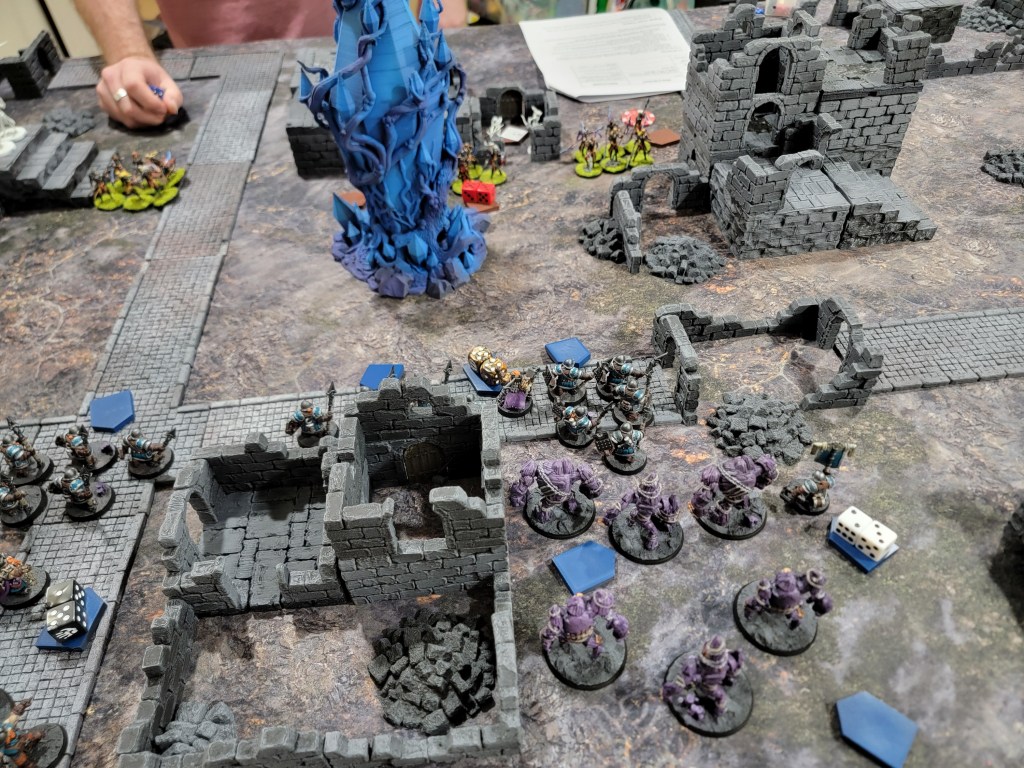 In our test game, we ended up pressed between a rock and a hard place—and I couldn’t get my golems into the fight if I wanted to, but he had the ability to slip another single model leader in there. It hit me that if I had opted to make my dwarves units of 2 men instead of 5 (which our ruleset does not currently prohibit) I could have readily gotten a golem in there.