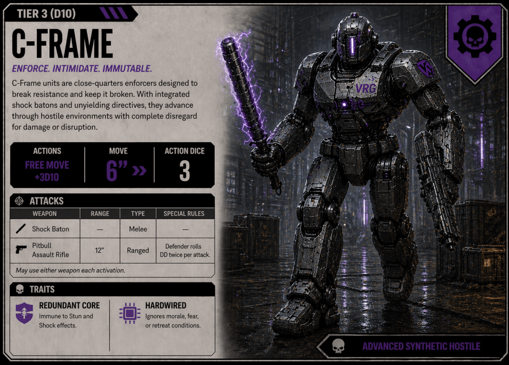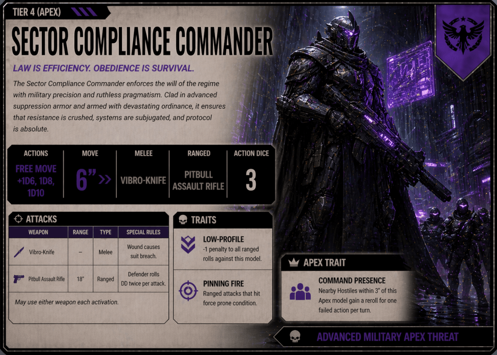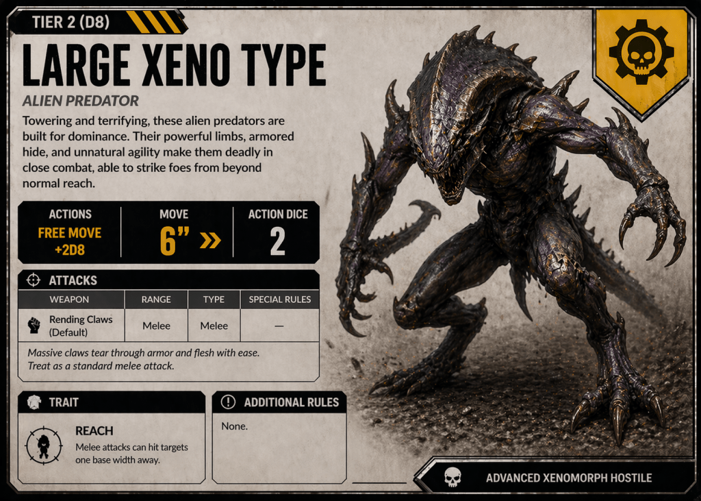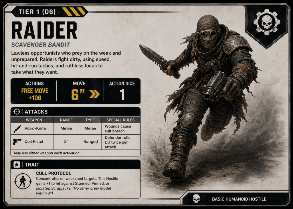 The AI did fine to start out. There’s a bit of repetition on the cards that really isn’t necessary. Here, it tells you the Tier I enemies get one action dice, but it also tells you they get a Free Move +1D6. Accurate, but repetitive. The cards appear otherwise fine… but I found it hard to keep the AI focused in its execution.