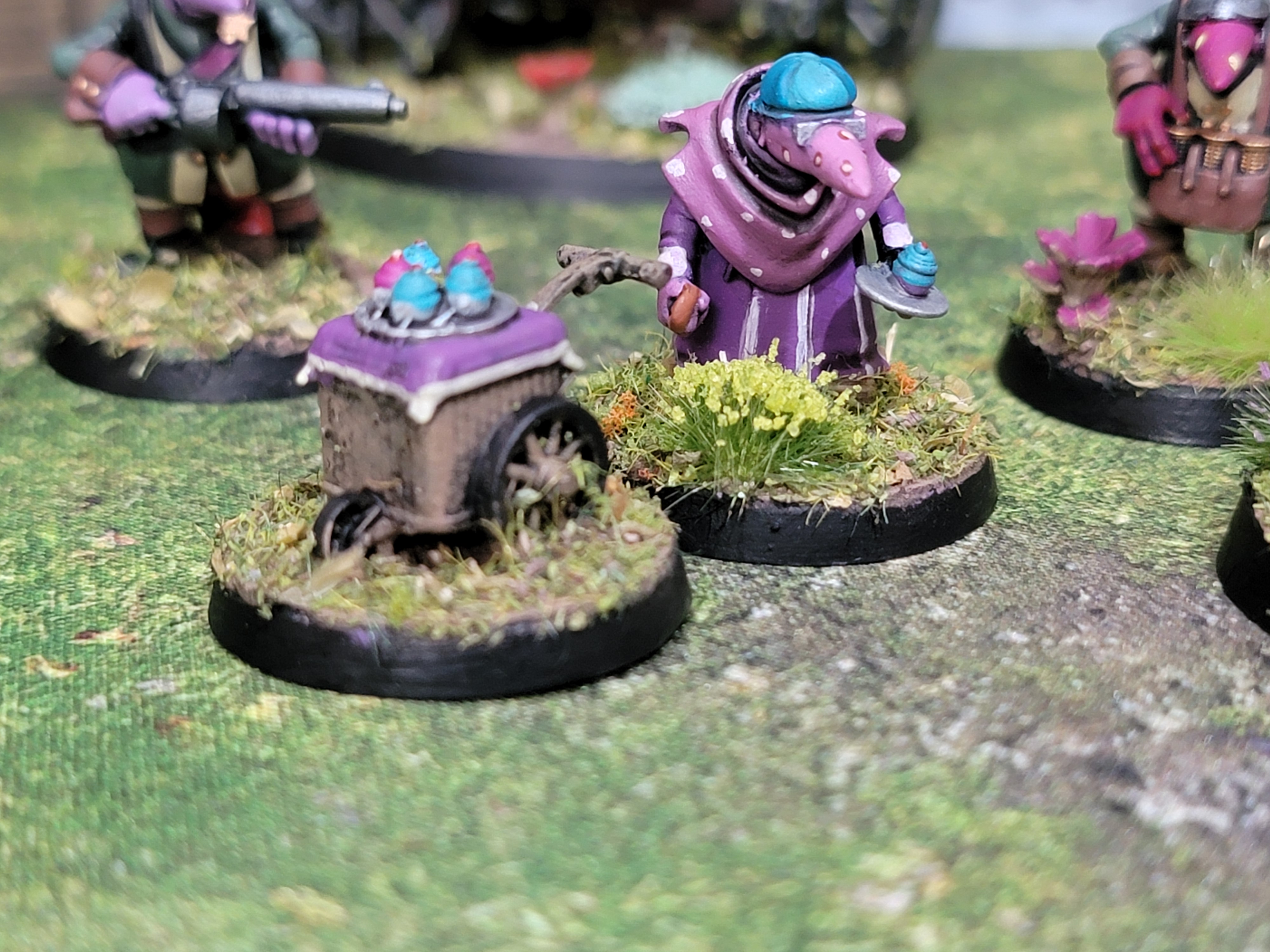 Next up, we have the standout model you’ve seen in the backgrounds above: the Home Dyna. She’s effectively a mom or grandma who is following the troop around, cooking for them. An important aspect of A Clash of Rhyfles is that most of the time when a Quar goes down, they go Out of Action–this means they aren’t “dead,” but down. You can check on them and roll on a chart to see if they’re actually just stunned. The Home Dyna, who marches around with a cart full of mothcakes, is able to bring a group of troops back from OOA status within a 2″ bubble by waving her mothcakes around.