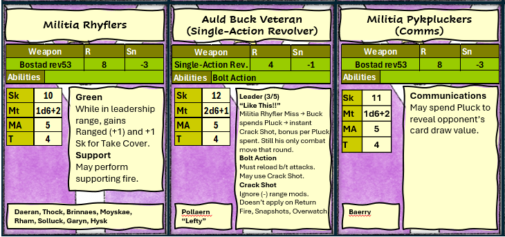 I actually went through and built a list of names for the Quar, which I built into unit cards that I made for the force. The cards are created in PowerPoint and I’ll likely make them available after I finish building some for my Gloam Hyyn. They’ll require updates over time–the lists for this game are still being tweaked. My squad HMG just got updated pretty significantly, so I’d have to update and reprint its card if I had already printed it.